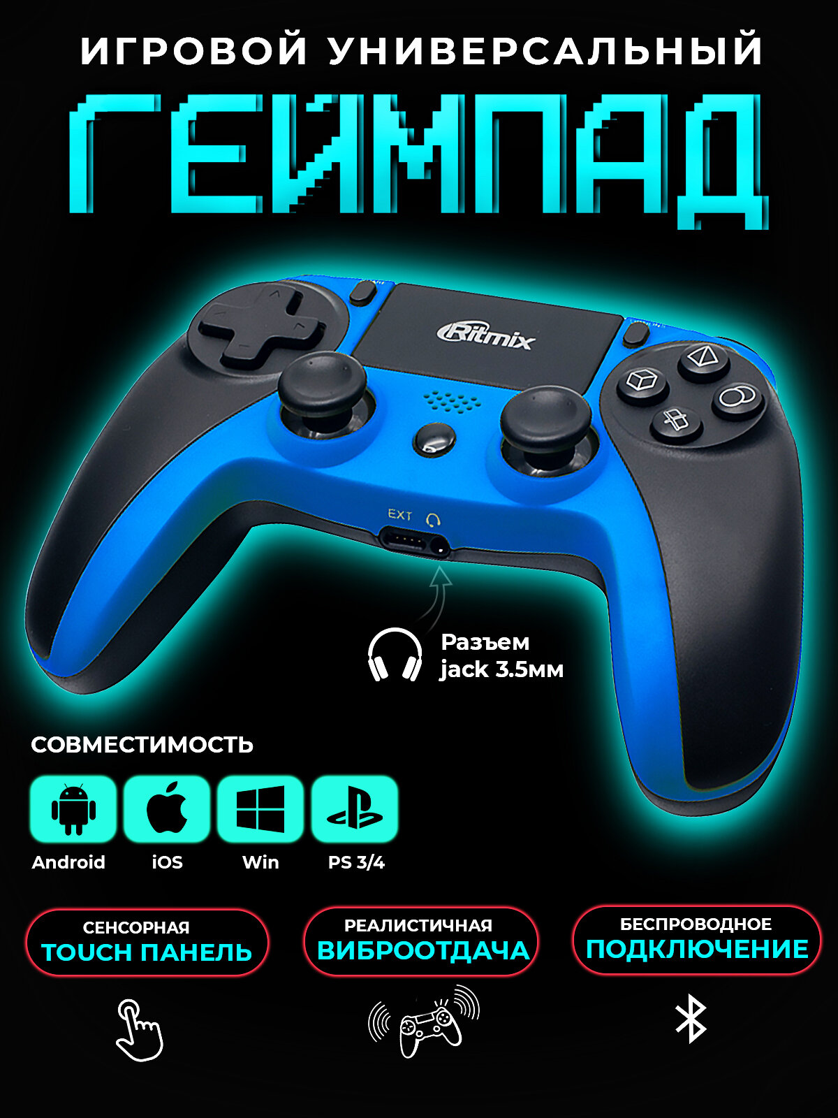 Геймпад RITMIX GP-063BTH Black-Blue,беспроводной Bluetooth, поддерживает Android, OS, Windows , P4, тач панель (1/20)