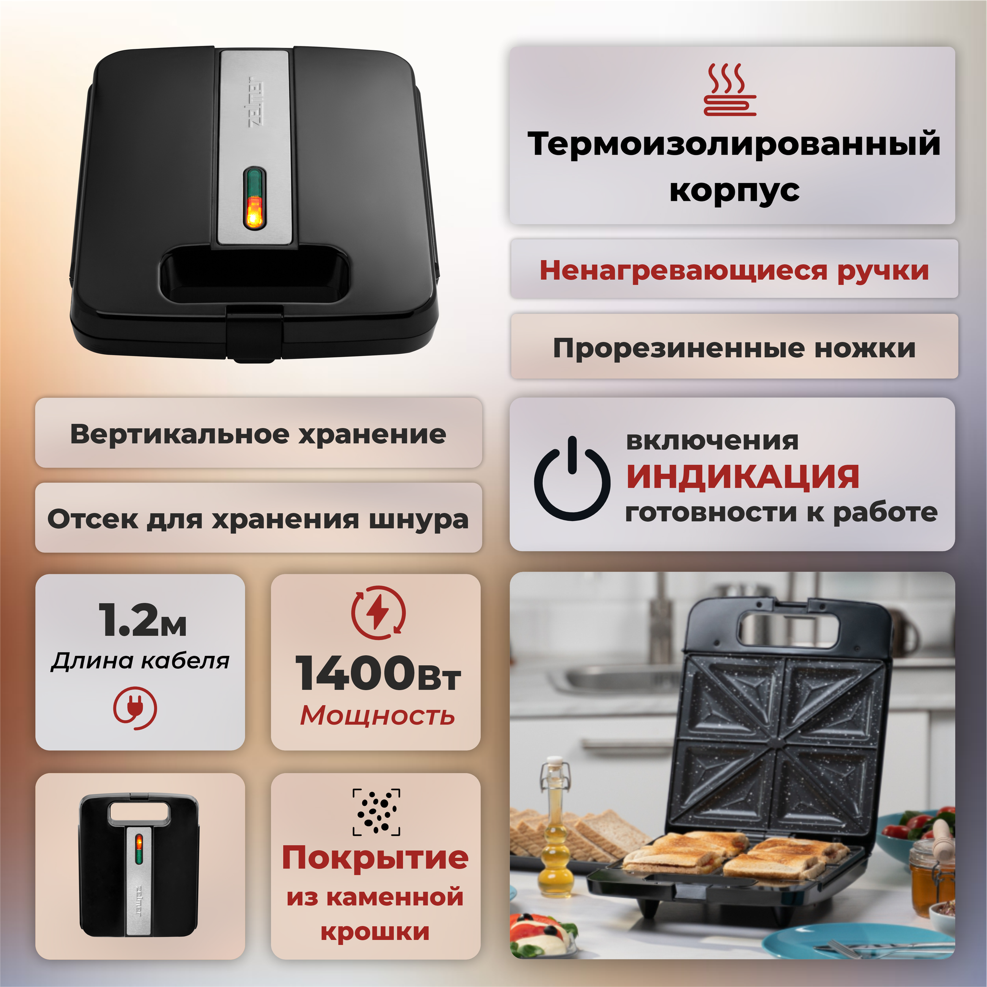 Сэндвичница Zelmer ZSM7400, 1400 Вт, антипригарное покрытие, чёрная