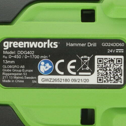 Дрель-шуруповерт аккумуляторная Greenworks GD24DD60, 24V, бесщеточная, без АКБ и ЗУ