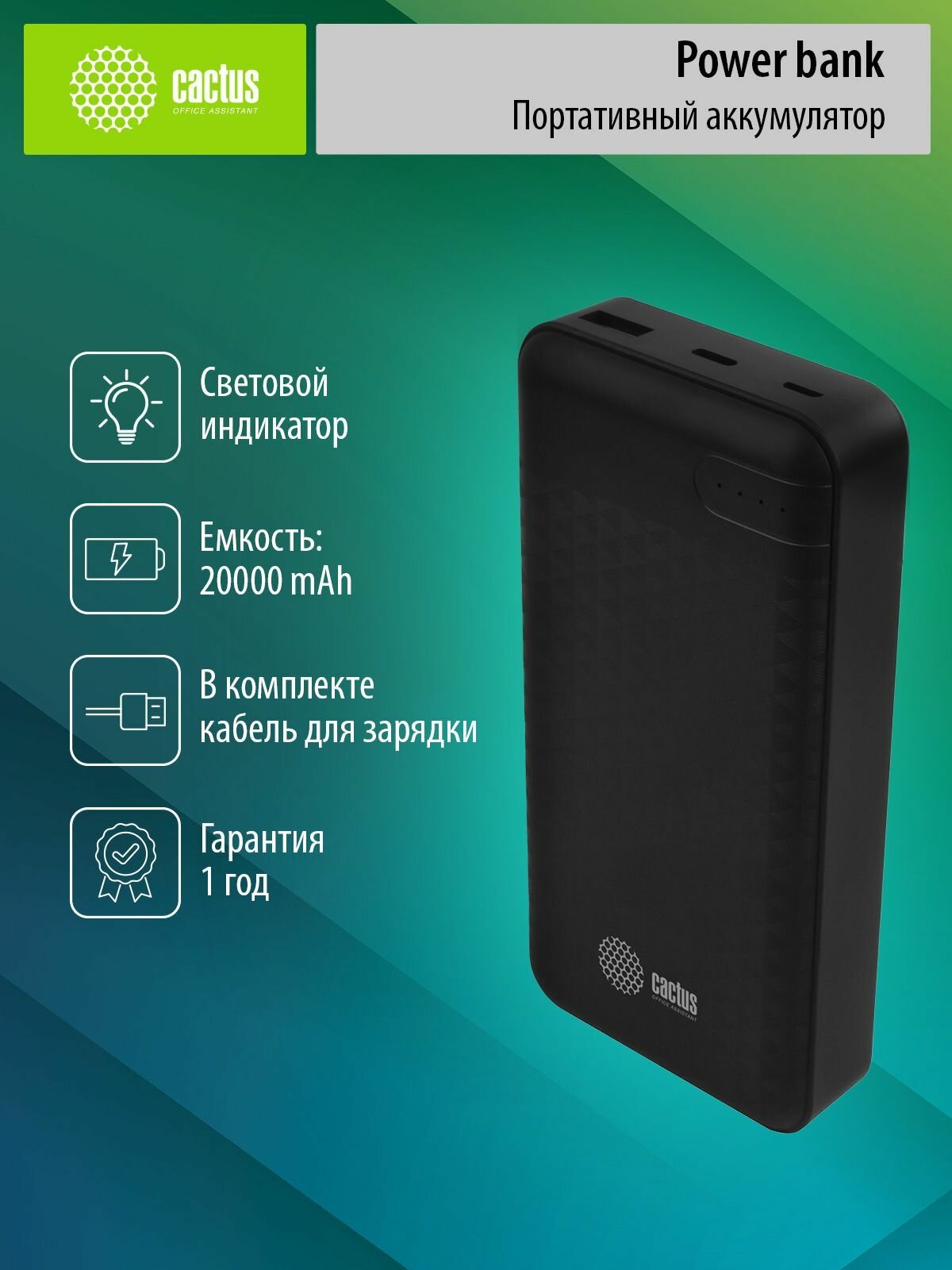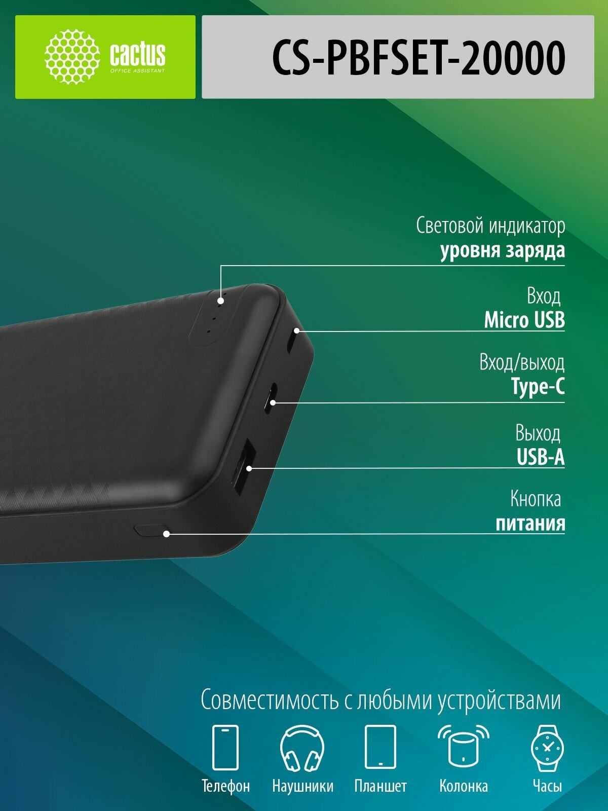 Аккумулятор внешний Cactus CS-PBFSET-20000 20000 мАч, 2 А, USB 2.0/USB Type-C (CS-PBFSET-20000)