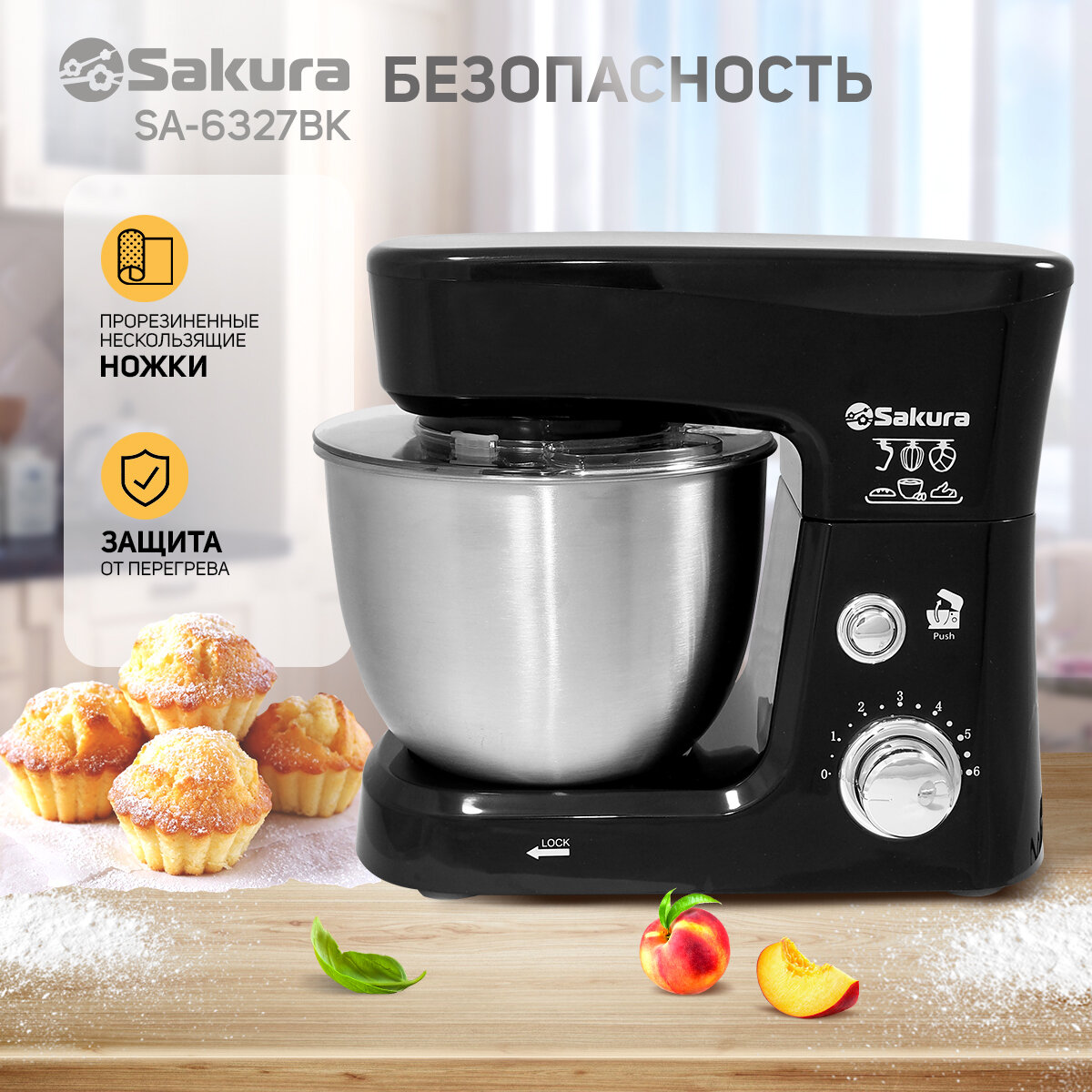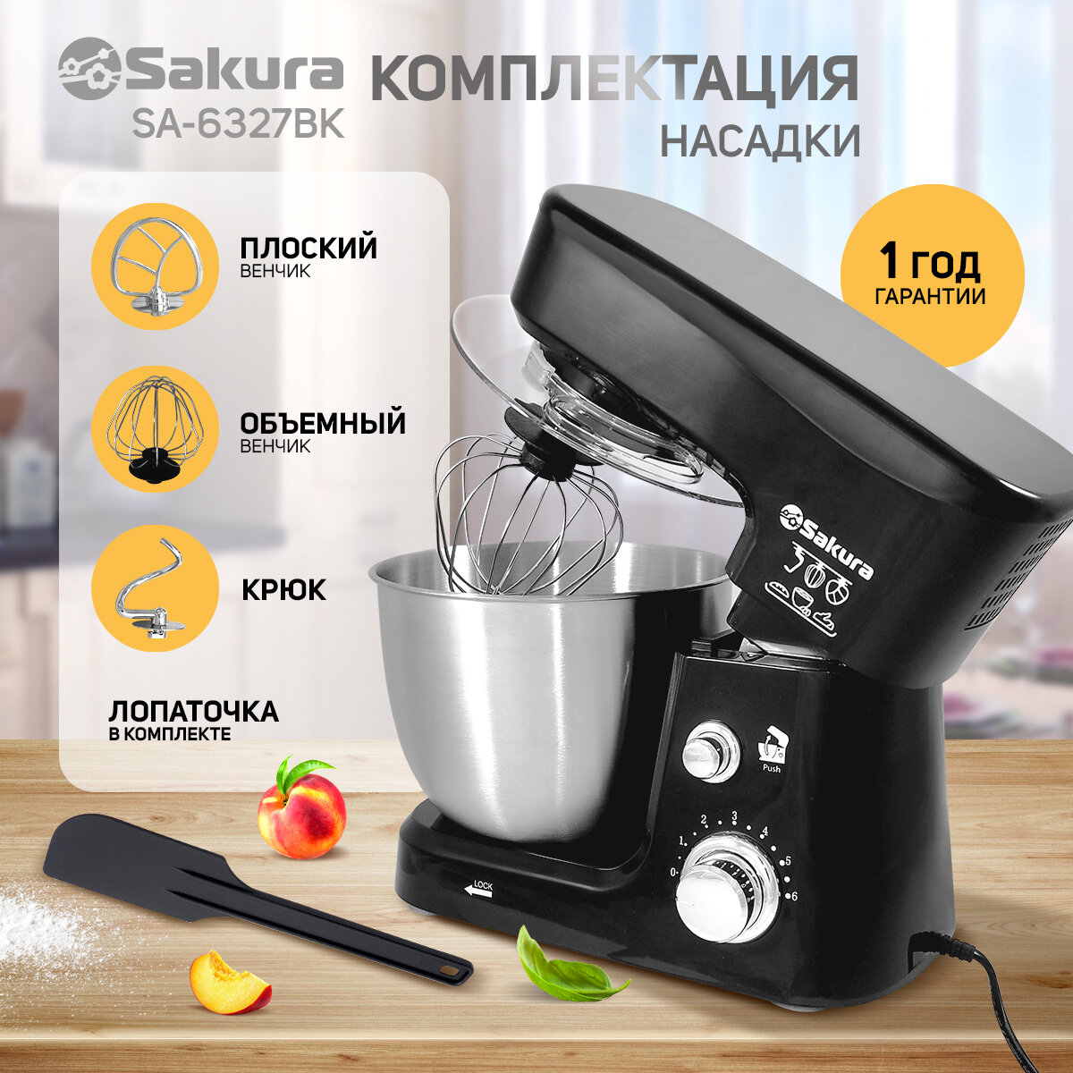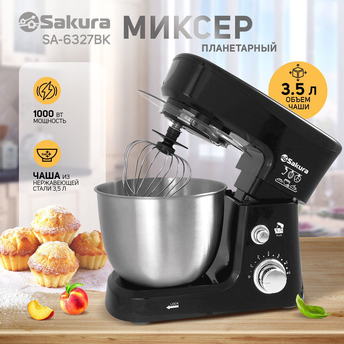 Миксер электрический Sakura SA-6327BK планетарный 1000Вт 3,5л 6 скоростей интересное:
