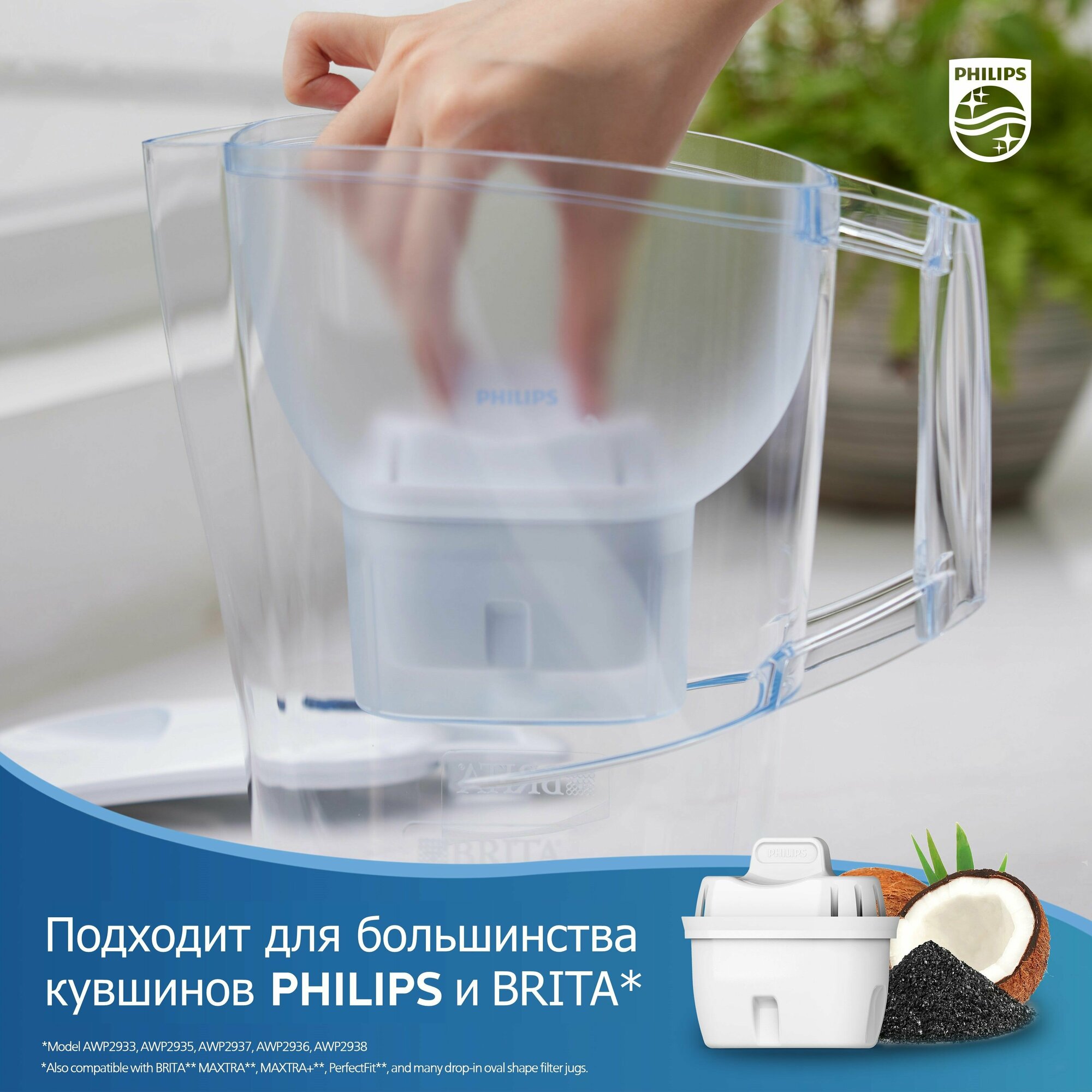 Универсальные картриджи Philips AWP210P2 для фильтр-кувшина Брита и Филипс, 2шт, задерживают хлор, известь, тяжелые металлы, не содержит BPA