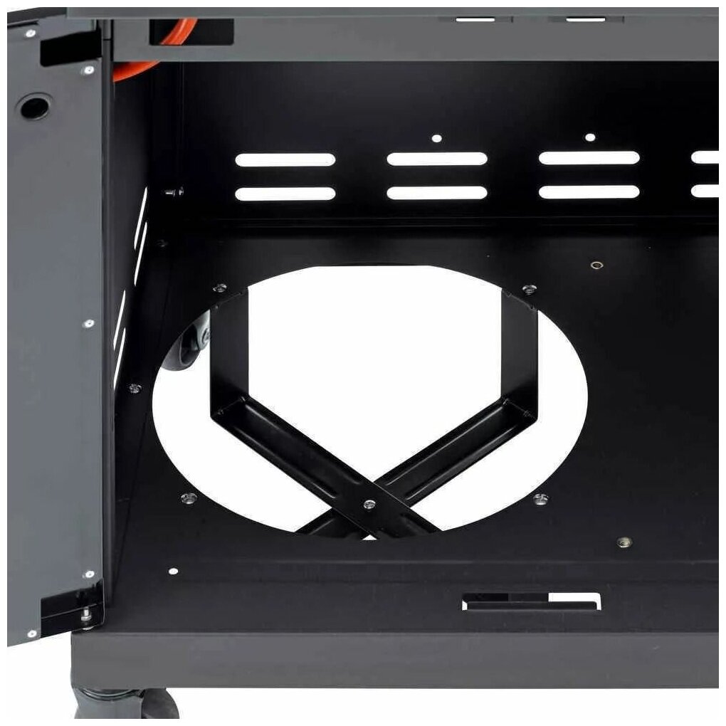 Гриль на колёсах, легко двигать. Баллон прячется внутри и не портит общий внешний вид. |