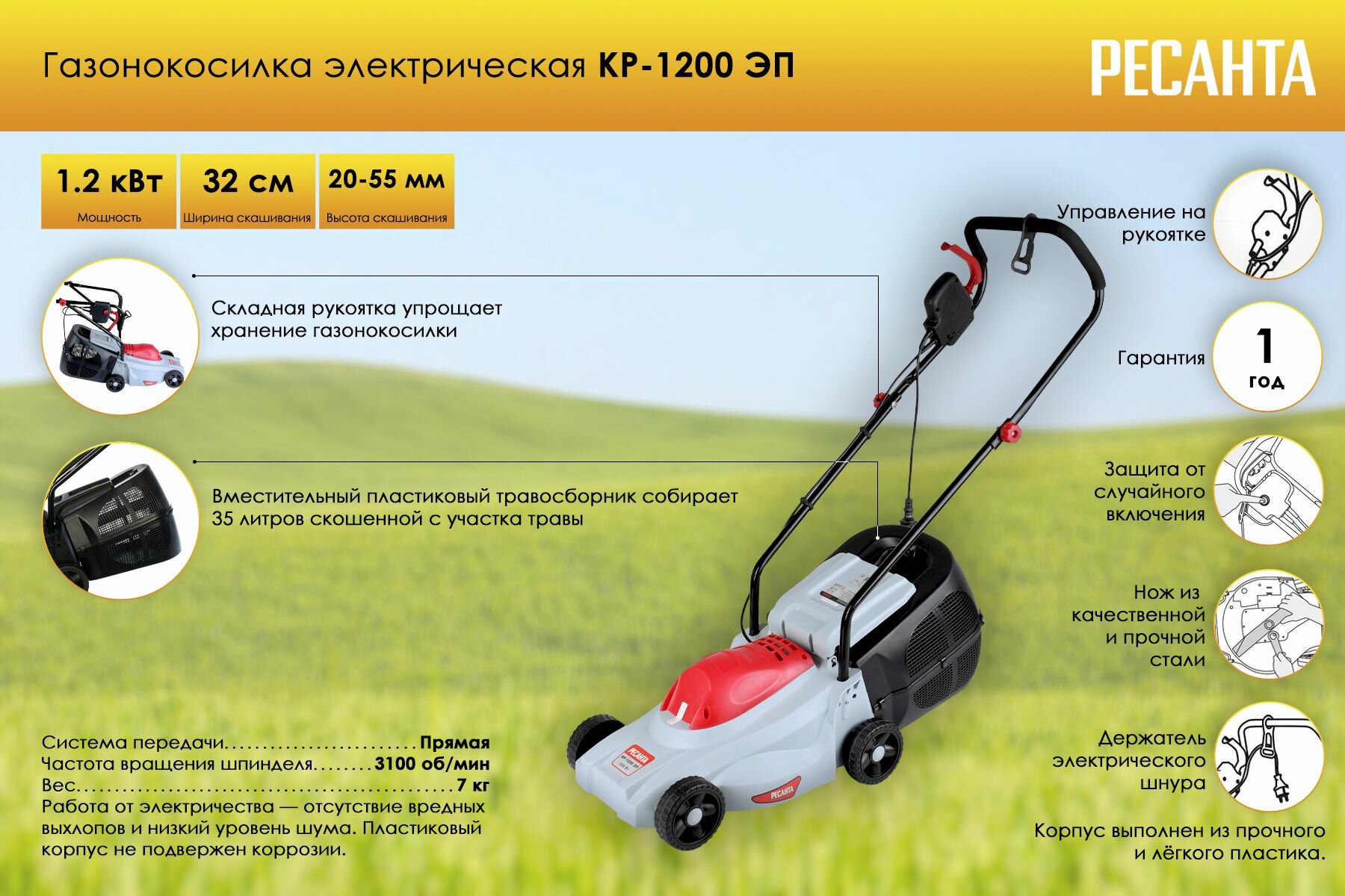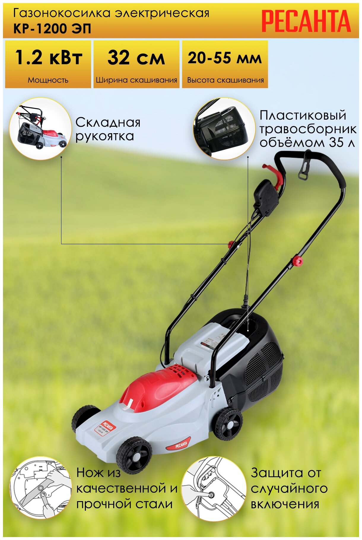 Электрическая газонокосилка Ресанта КР-1200 ЭП (1200 Вт, 3100 об/мин, 35 л, от 20 мм до 55 мм, ширина - 320 мм)