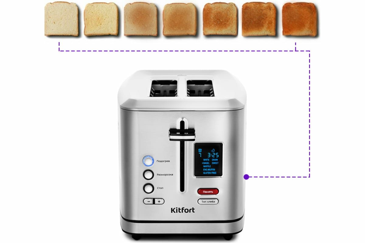 | Плюсы: | Металлический корпус. Цифровое табло индикации. Семь уровней прожарки. Удобный лоток для крошек. Есть функция подогрева. Есть функция размораживание. |