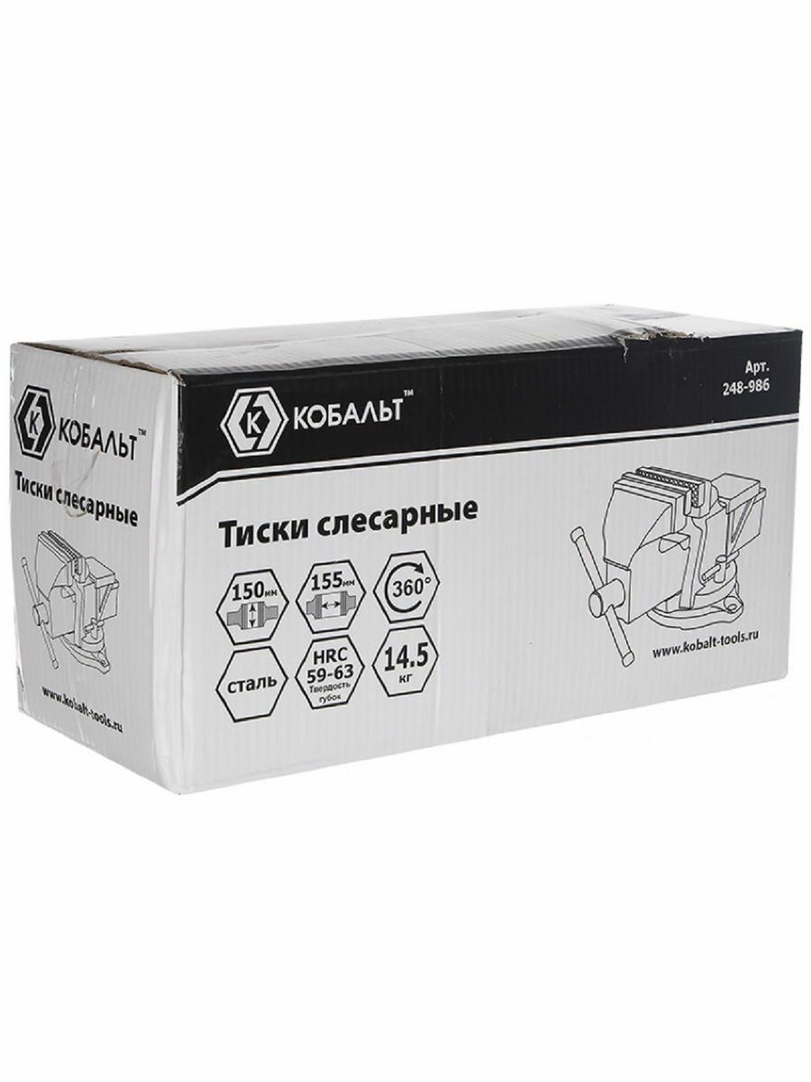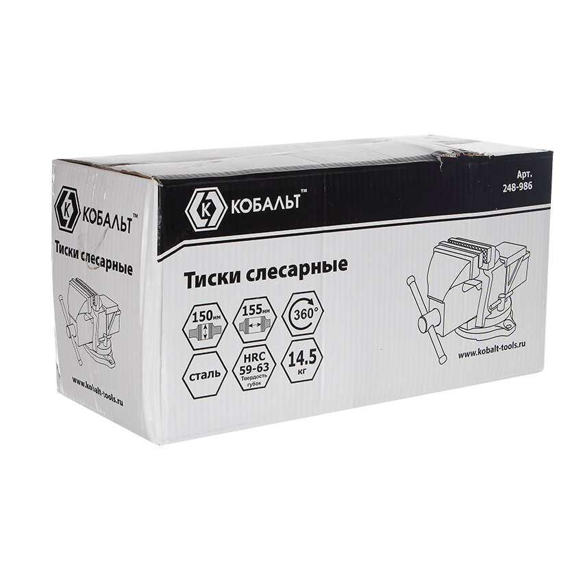 Тиски слесарные поворотные кобальт стальные, ширина губок 150 мм, захват 150 мм,14.5 кг, наковальня, коробка (ширина губок 150 мм, захват 150 мм, 14.5 кг, наковальня, коробка)