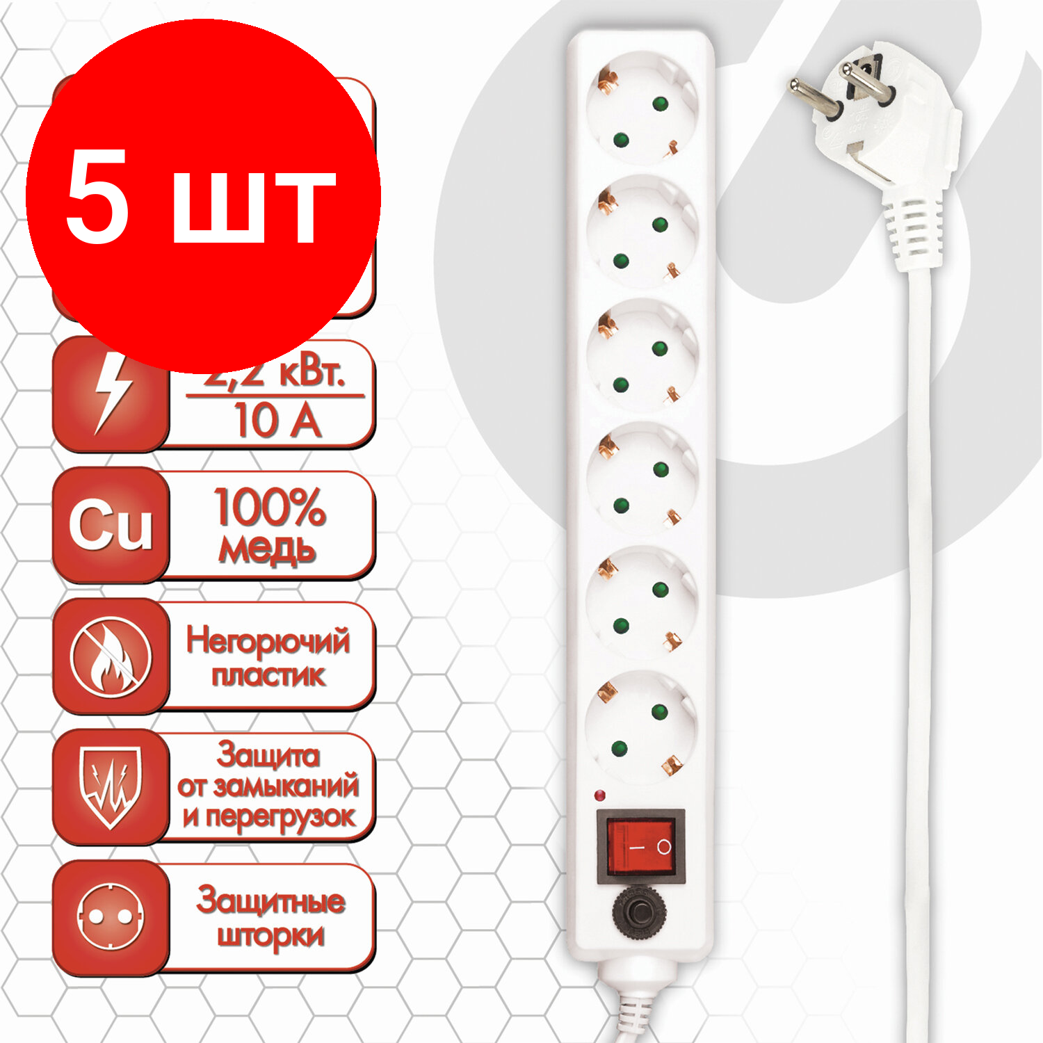 Купить Комплект 5 шт, Сетевой фильтр SONNEN U-363, 6 розеток, с заземлением, выключатель, 10 А, 3 м, белый, 511426