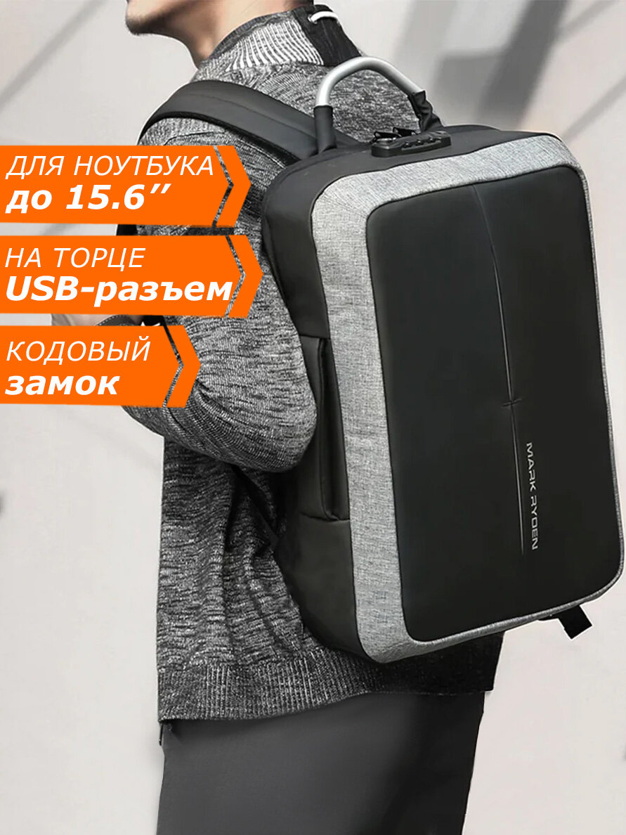 Рюкзак-сумка городской дорожный мужской Mark Ryden средний 19л, для ноутбука 15.6", с кодовым замком, потайным карманом, непромокаемый, цвет серый