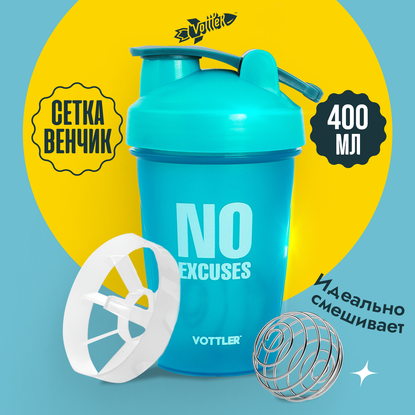 Шейкер для спортивного питания протеина с венчиком и сеткой 400 мл VOTTLER