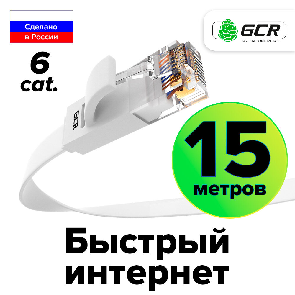 Купить LAN кабель 15м GCR PROF плоский UTP cat.6 10 Гбит/с RJ45 LAN кабель для интернета контакты 24K GOLD (GCR-LNC62) белый