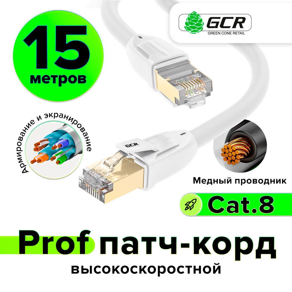 Купить Провод LAN 15м PROF LSZH S/FTP cat.8 40 Гбит/с RJ45 LAN ethernet high speed компьютерный кабель для интернета медный экранированные коннекторы контакты 24K GOLD (GCR-L306) белый
