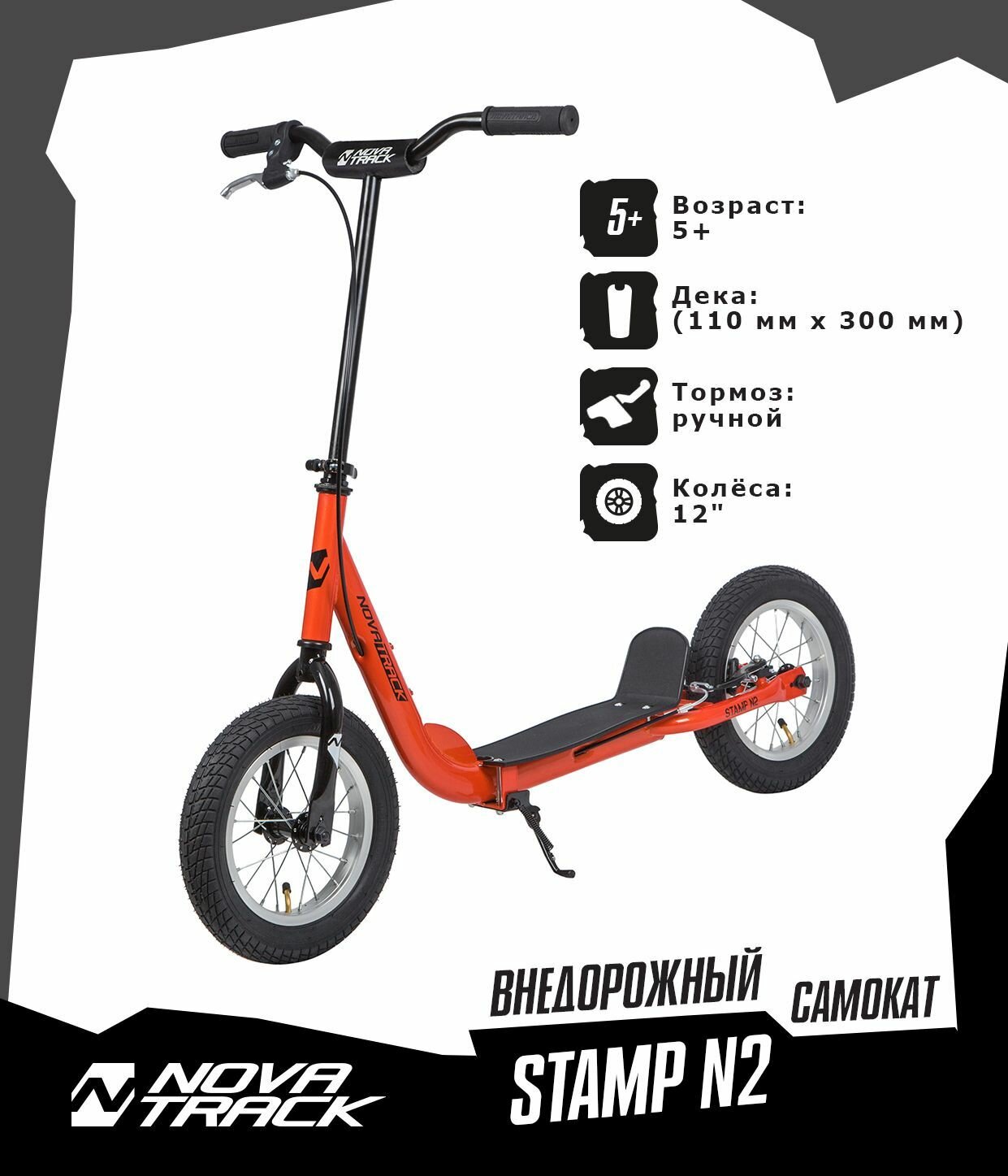 самокат 2-х колесный 12/12" внедорожный подростковый stamp n2 2020 стальной не складной 100 кг оранжевый novatrack 12stampn2.or20
