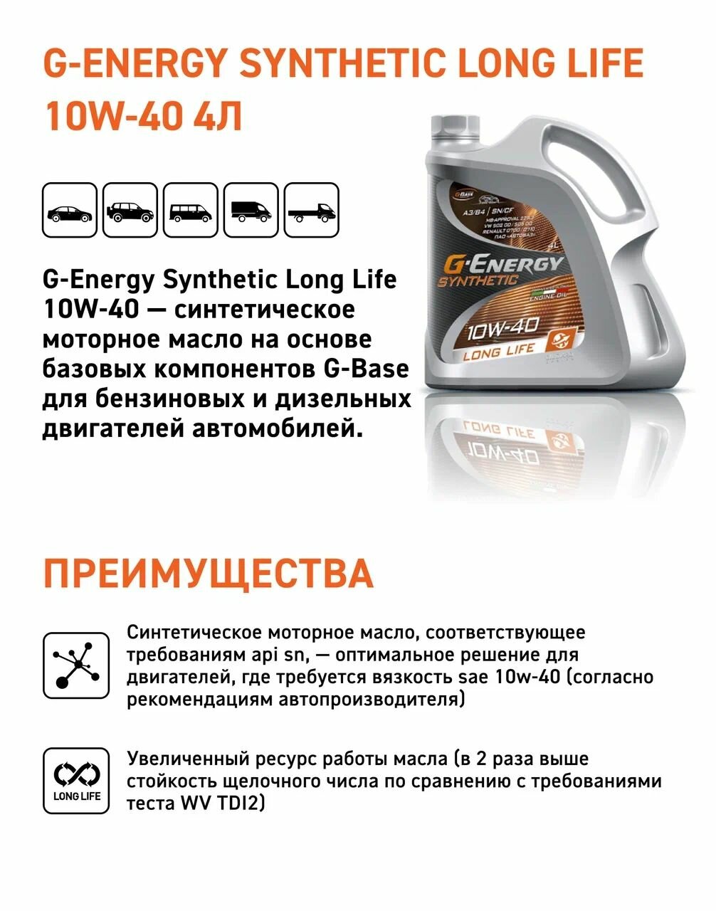 масло g-energy 10w40 synthetic long life api sn/cf acea a3/b4 4л син