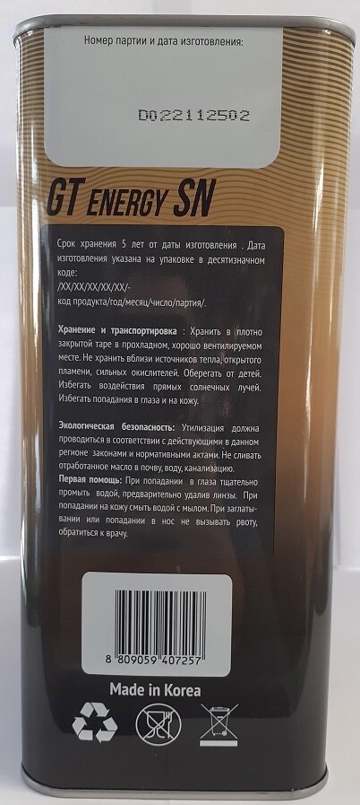 Мой выбор — моторное масло GT OIL ENERGY SN 5W-30, артикул 4л — 8809059407257 (на всякий случай записал артикул 1л — 8809059407240). Уменьшает потери на трение и увеличивает срок жизни двигателя Обеспечивает легкий пуск и быстрое смазывание системы двигателя при низких температурах, благодаря отличной низкотемпературной текучести Увеличивает срок службы катализаторов последнего поколения Снижает потребление топлива Обеспечивает надёжную защиту деталей двигателя от износа при любых режимах вождения Эффективно предотвращает формирование смолистых и лаковых отложений Обладает прекрасной термической и окислительной стабильностью |
