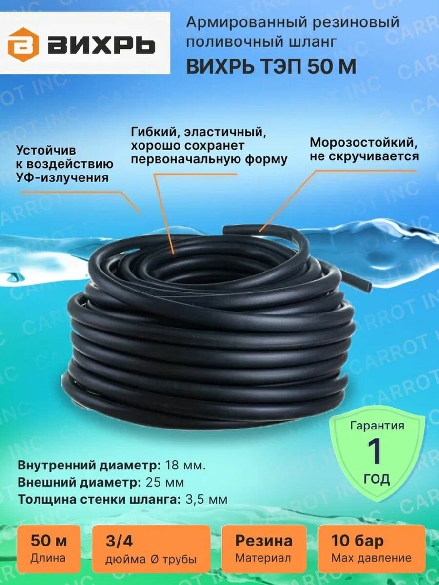 Вихрь Шланг резиновый армированный, 18х23-1,0 - ВГ. ТЭП, бухта 50 м чёрный 73/7/2/3