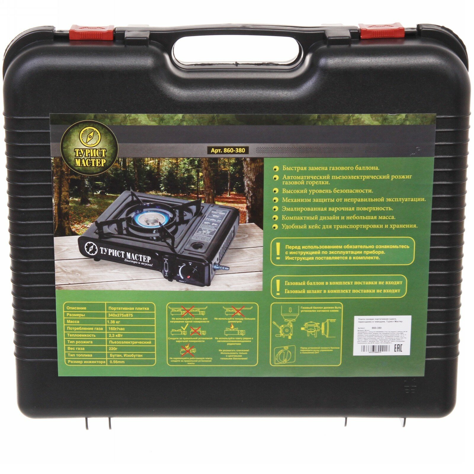 Плита газовая портативная (цанга, переходник) в чемодане, Турист Мастер
