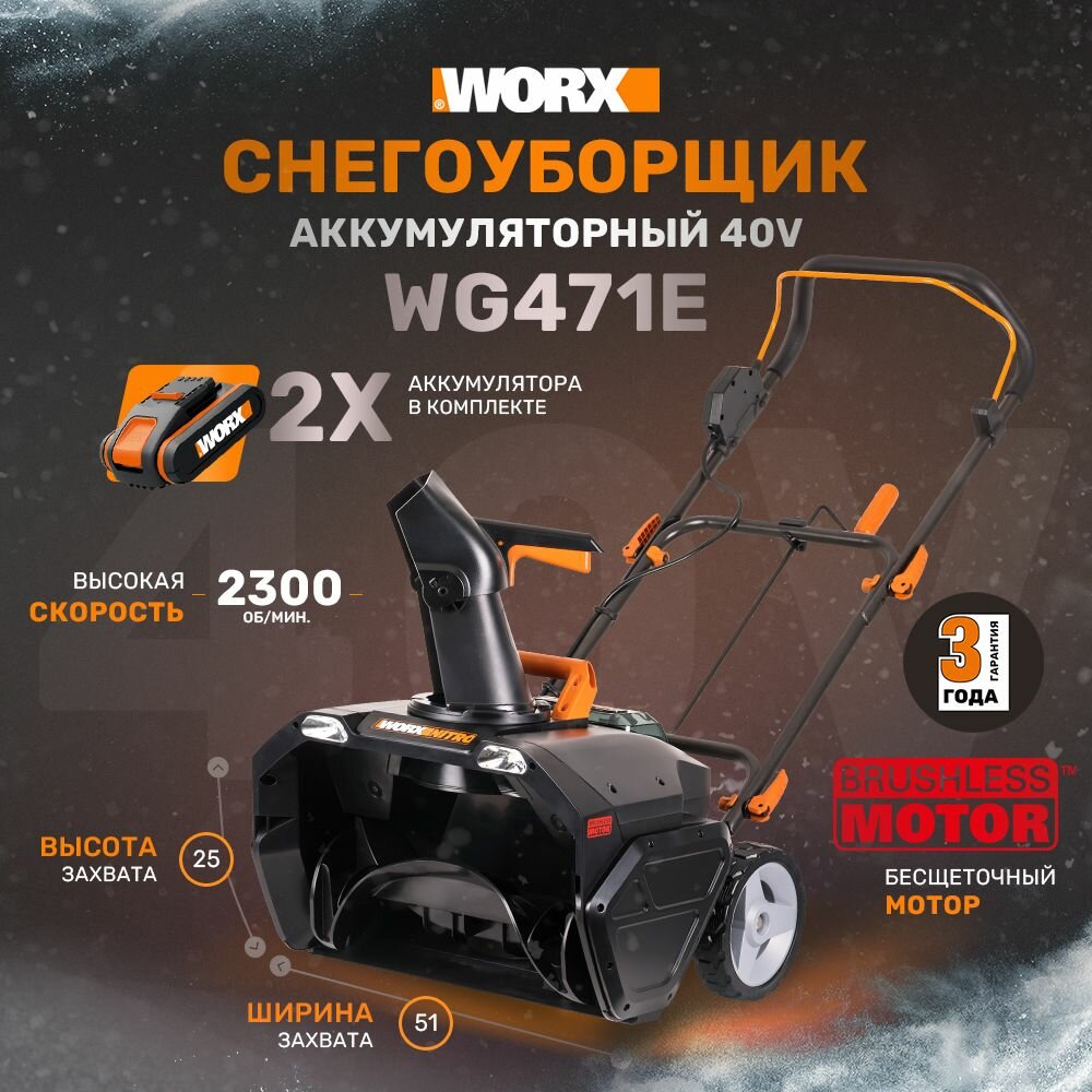 Снегоуборщик аккумуляторный WORX WG471E, 40В, 50см, бесщеточный, 2 АКБ 4А*4 и ЗУ