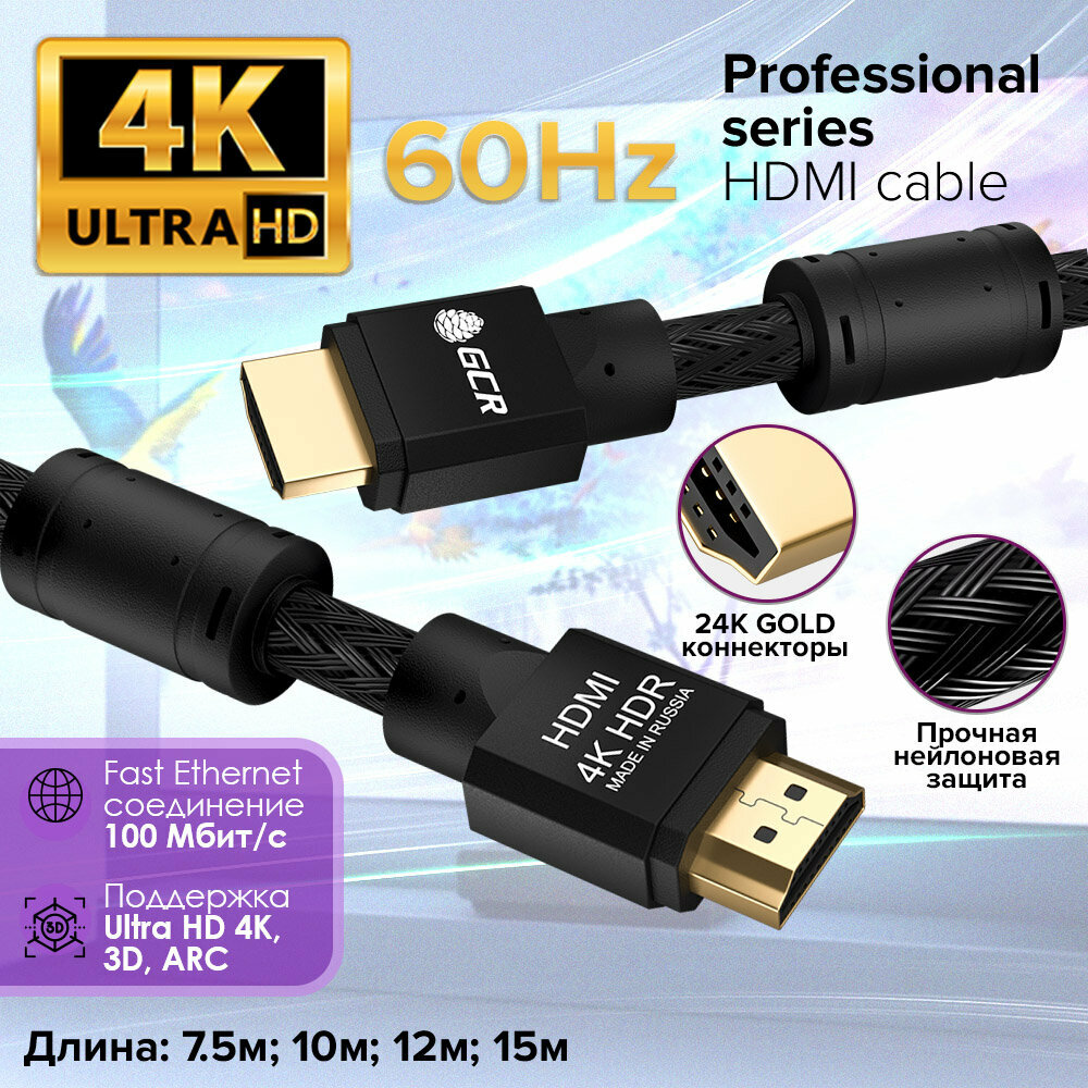 Провод 15м GCR Ultra HD 4K 3D 18 Гбит/с частично нейлон черный с ферритовыми кольцами 24K GOLD