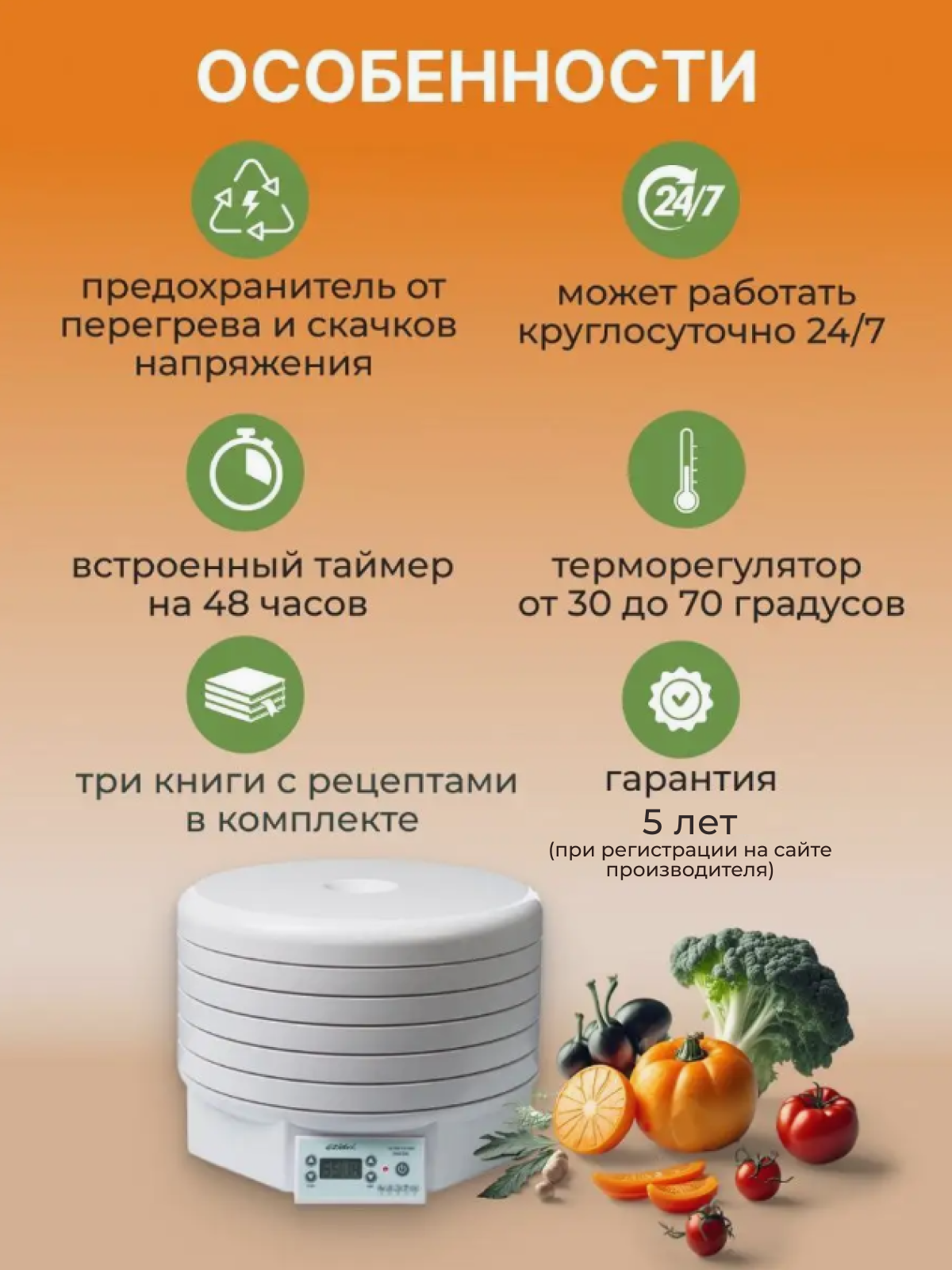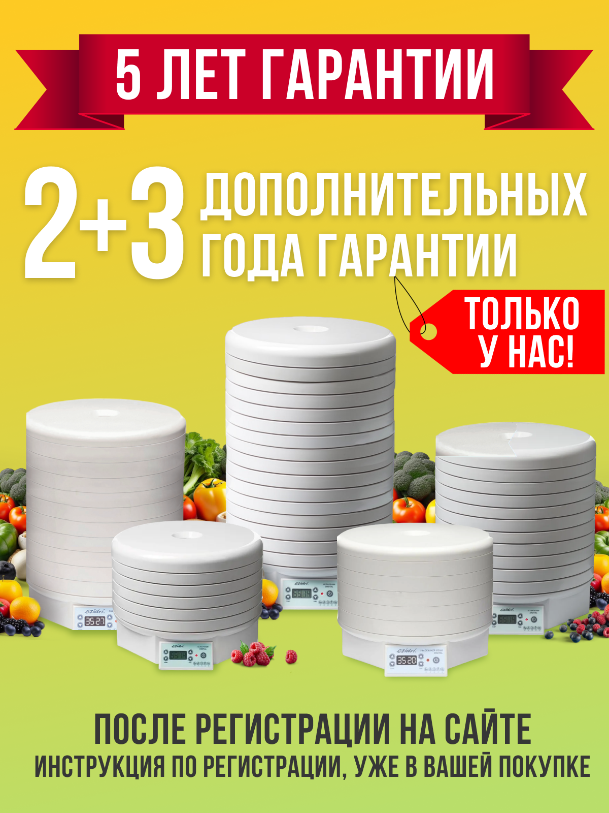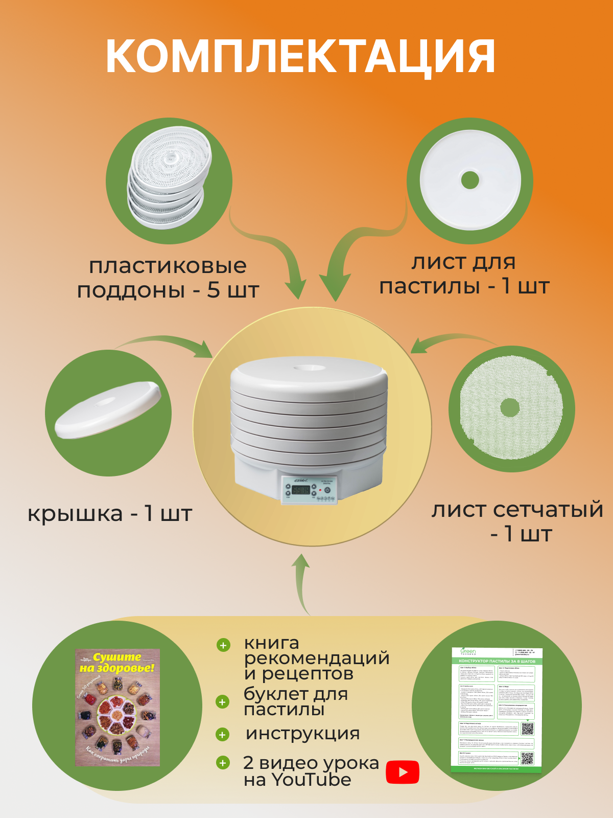 | Дополнительная информация | таймер 1ч - 48 ч; возможность увеличения объёма сушки за счёт приобретения дополнительных поддонов (до 30 поддонов); вес базы: 2.6 кг; вес базового комплекта не более 5 кг; крышка основания: огнеупорный поликарбонат; сетчатый лист и лист для пастилы: пищевой полипропилен; инструкция русская (с рецептами и советами по использованию сушилки + листовка «Меры предосторожности»); бонус: книга известного садовода Н.И. Курдюмова с большим количеством рецептов и хитростей домашнего производства «вкусностей» |
