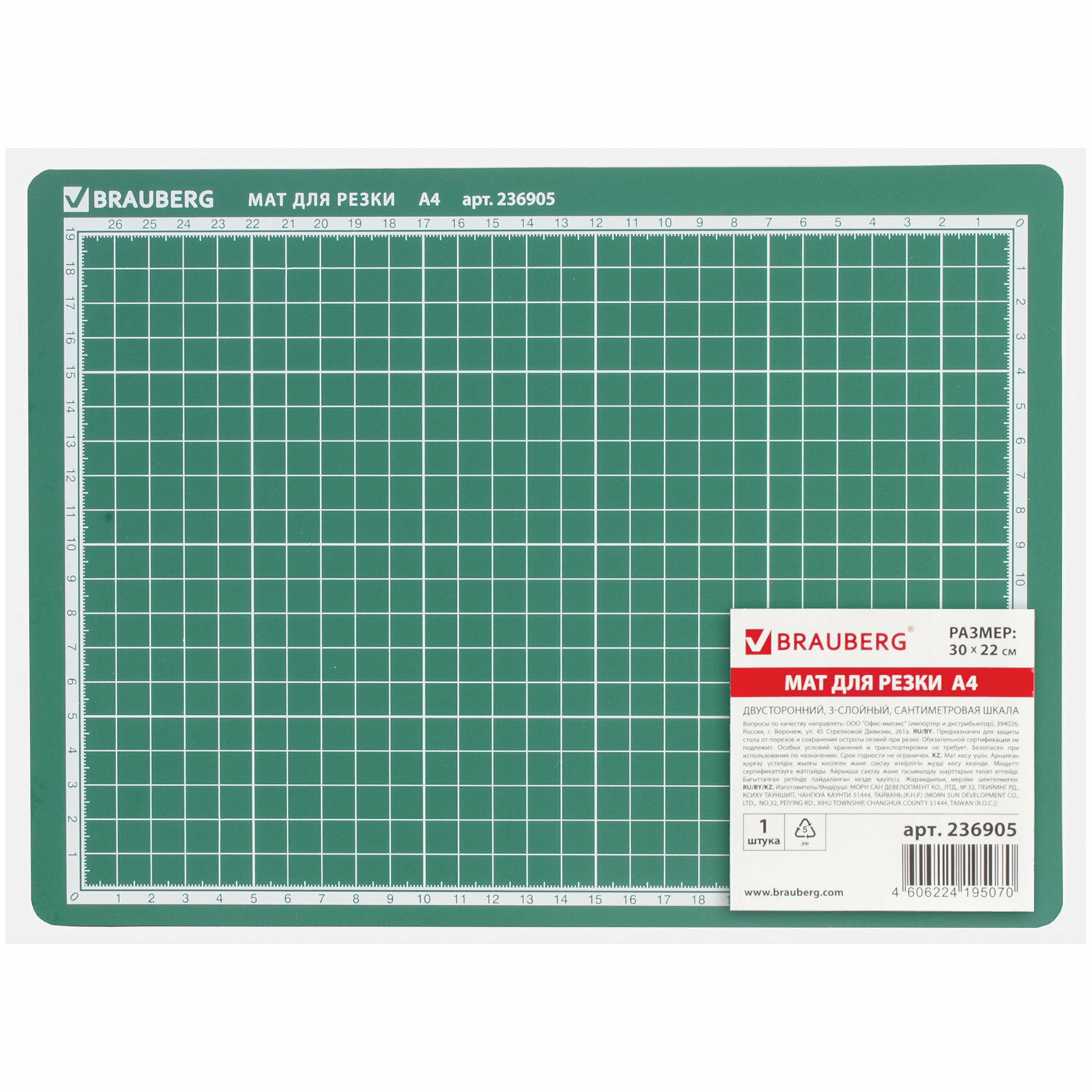 Коврик (мат) для резки Brauberg, 3-слойный, А4 (300х220 мм), двусторонний, толщина 3 мм, зеленый, 236905