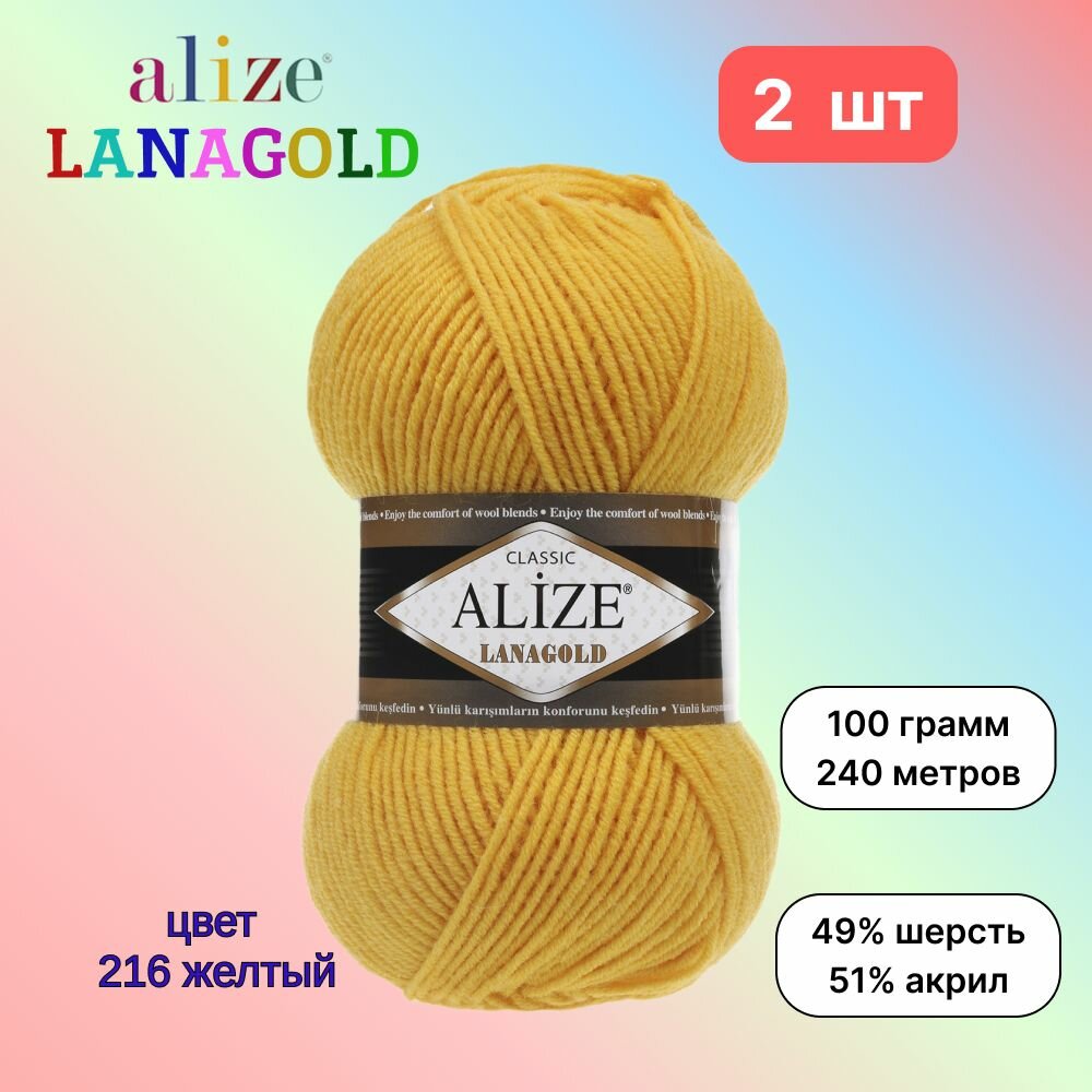 Купить Пряжа Alize Lanagold желтый (216), 51%акрил/49%шерсть, 240м, 100г, 2шт