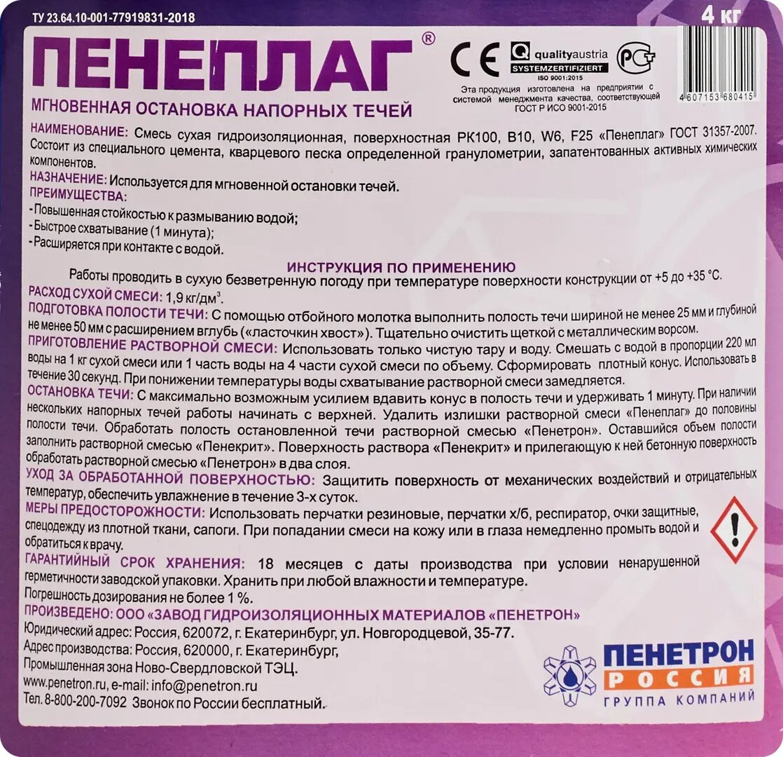 Пенетрон Пенеплаг, фасовка 4 кг интересное: