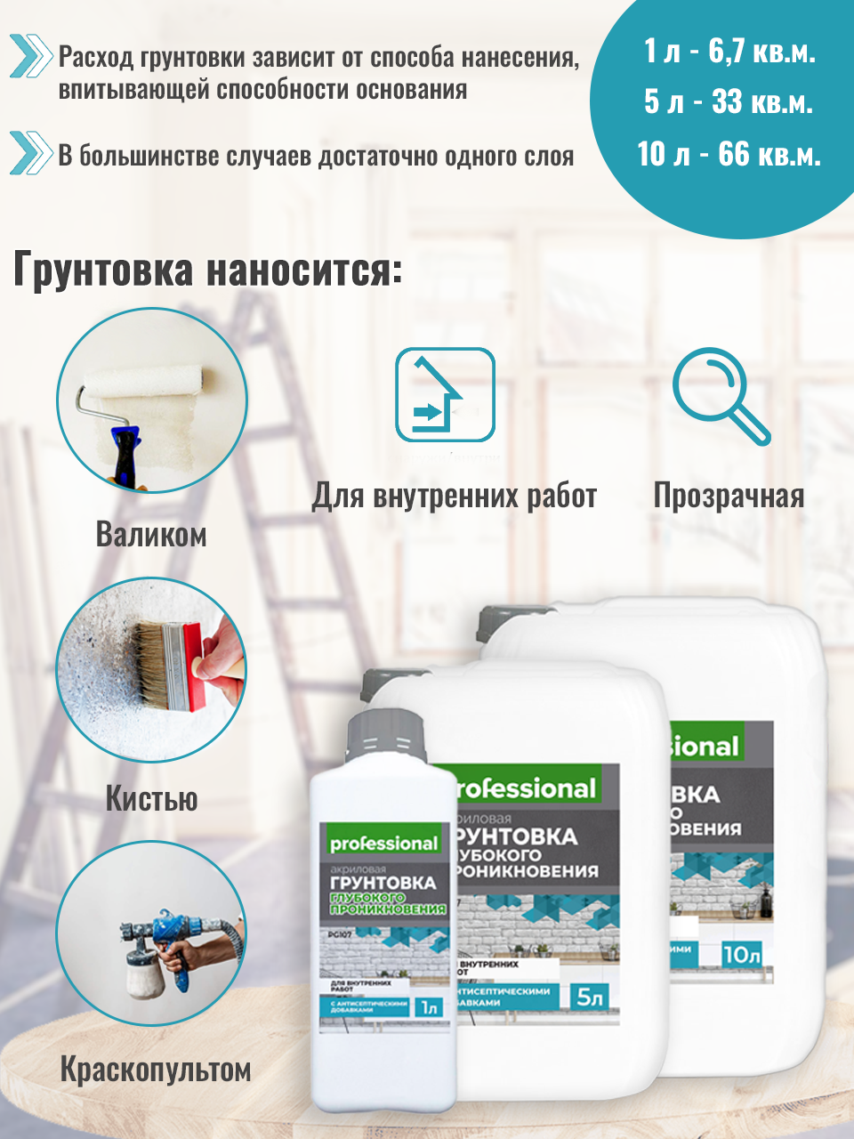 Professional Грунтовка глубокого проникновения для внутренних работ с антисептиком PG107, 1л, 28865