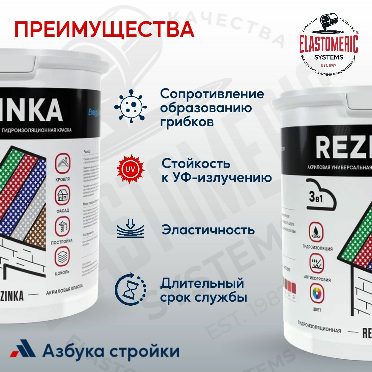Краска резиновая REZINKA универсальная акриловая эластичная для фасадов, интерьера, мебели, кровли, цоколей, моющаяся, быстросохнущая, без запаха, матовая 5л RAL 9003 сигнально-белый