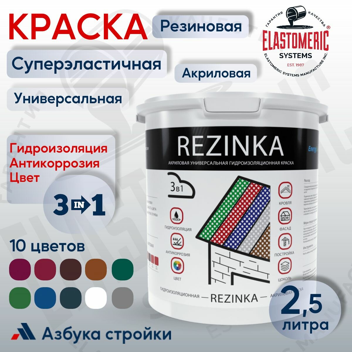Купить Краска резиновая REZINKA универсальная акриловая эластичная для фасадов, интерьера, мебели, кровли, цоколей, моющаяся, быстросохнущая, без запаха, матовая 2,5л RAL 8004 терракот
