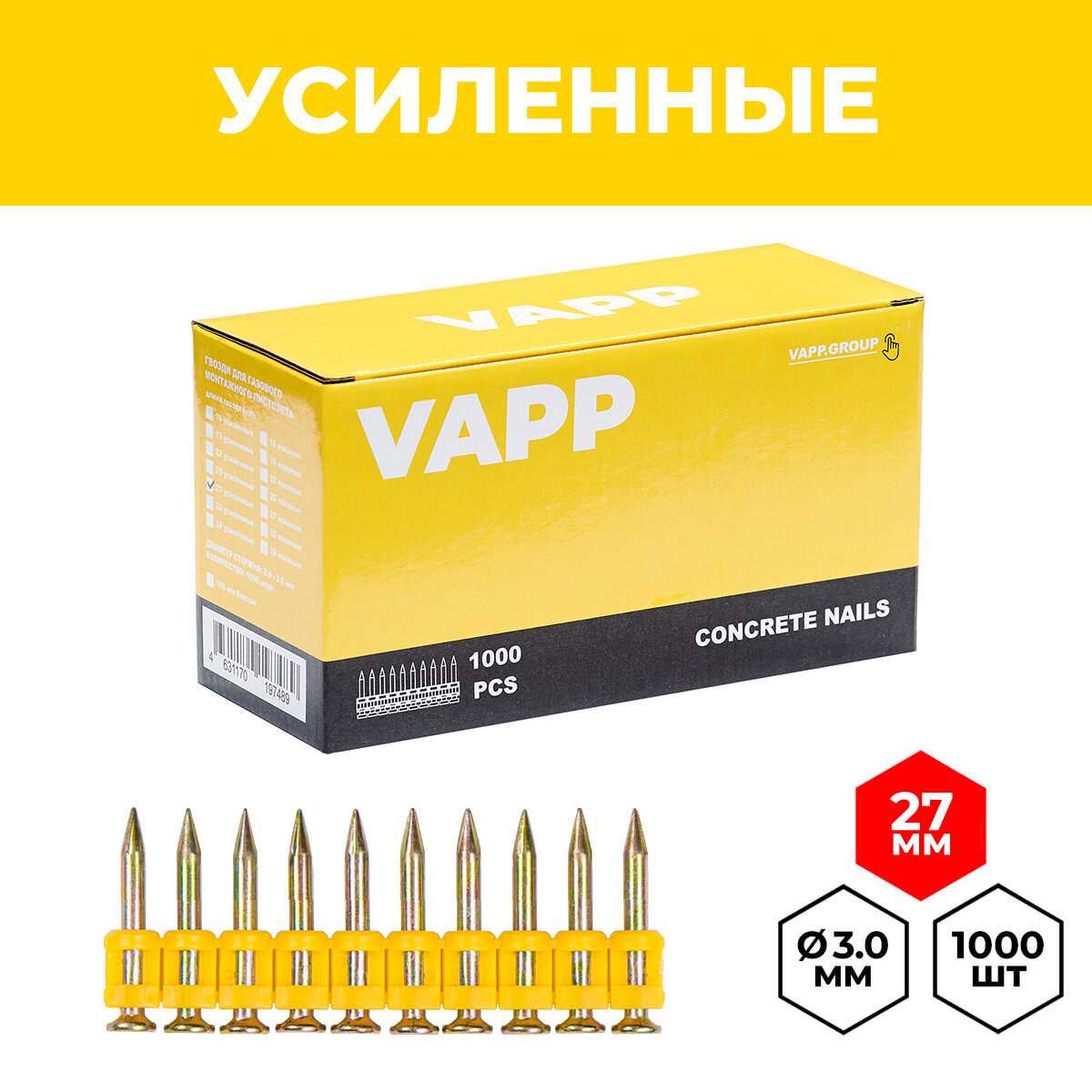 Купить Гвозди усиленные VAPP 3*27 мм для газового монтажного пистолета, 1000 шт.