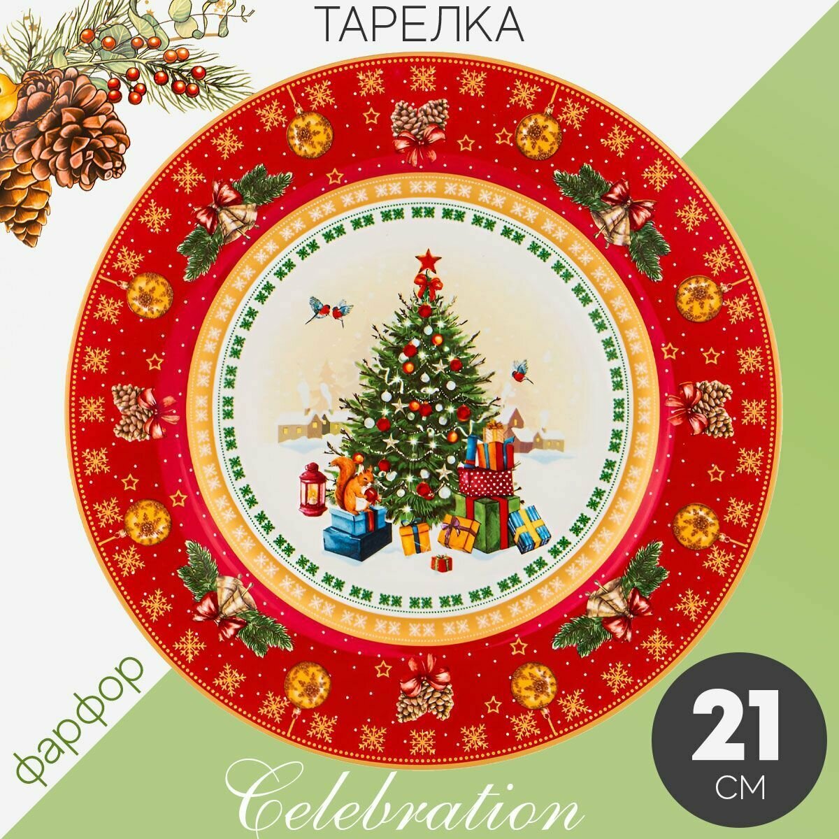 Купить Тарелка десертная обеденная 21 см Лефард Новогодняя, фарфор, мелкая красная, Lefard Елка для подачи блюд и сервировки стола