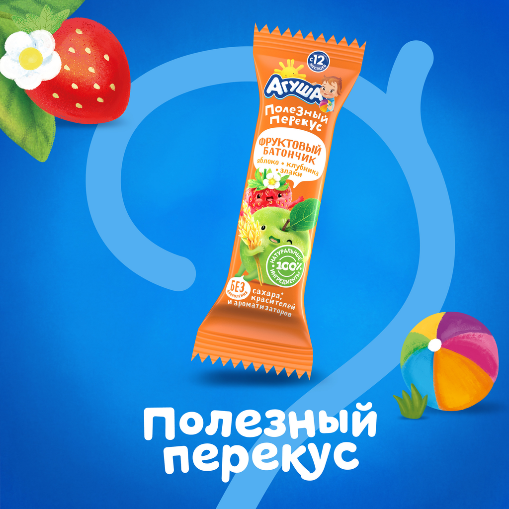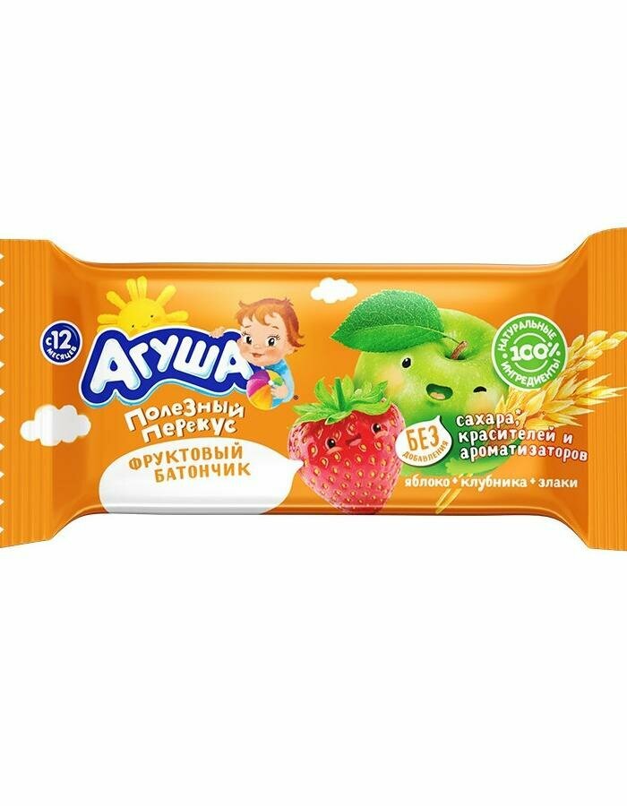 Батончик фруктово-злаковый агуша Полезный перекус, Яблоко, клубника и злаки, с 12 месяцев, 15г интересное: