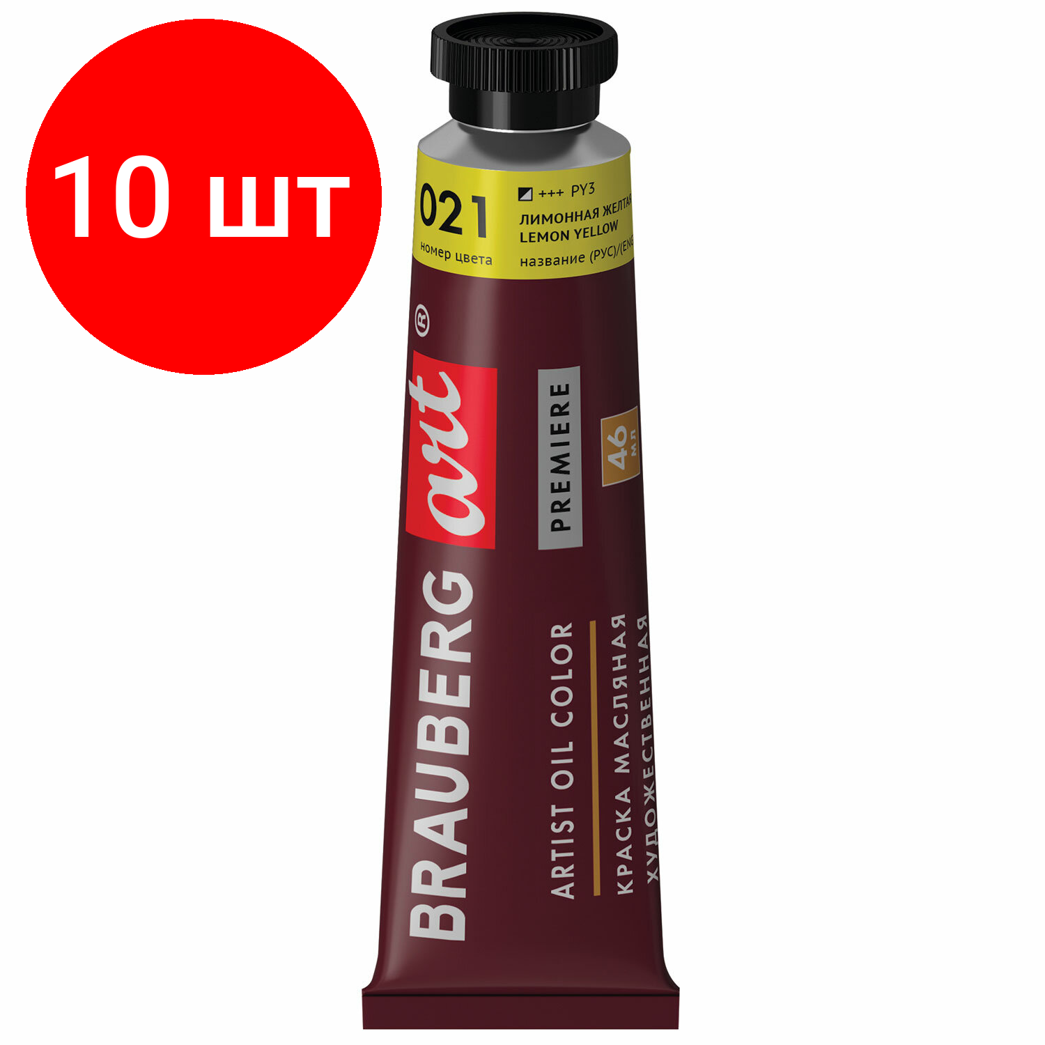Купить Комплект 10 шт, Краска масляная художественная BRAUBERG ART PREMIERE, 46 мл, проф. серия, лимонная желтая, 191398