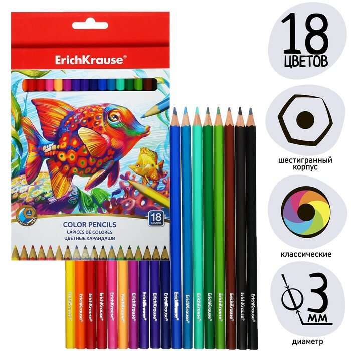 Карандаши 18 цветов ErichKrause, дерево, шестигранные, 3.0 мм грифель, картонная упаковка, европодвес