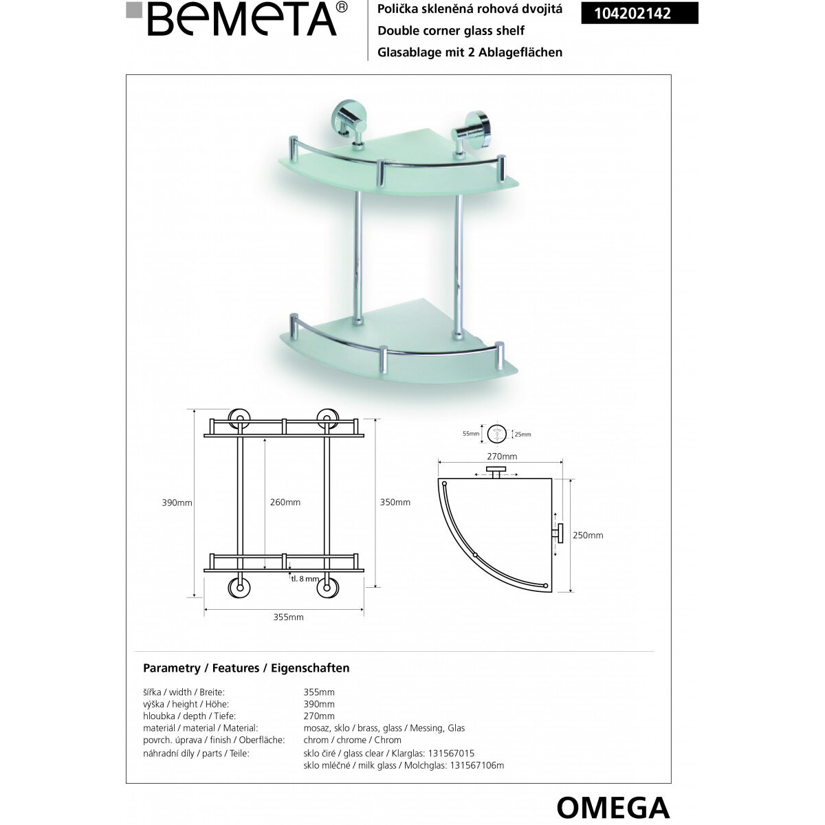 Полочка для ванной Bemeta Omega 355x390x270 угловая, двойная, стекло, хром 104202142