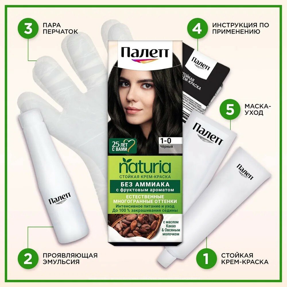СохранитьПалетт Naturia Стойкая крем-краска для волос, 1-0 Черный, 110 мл - 1 шт интересное: