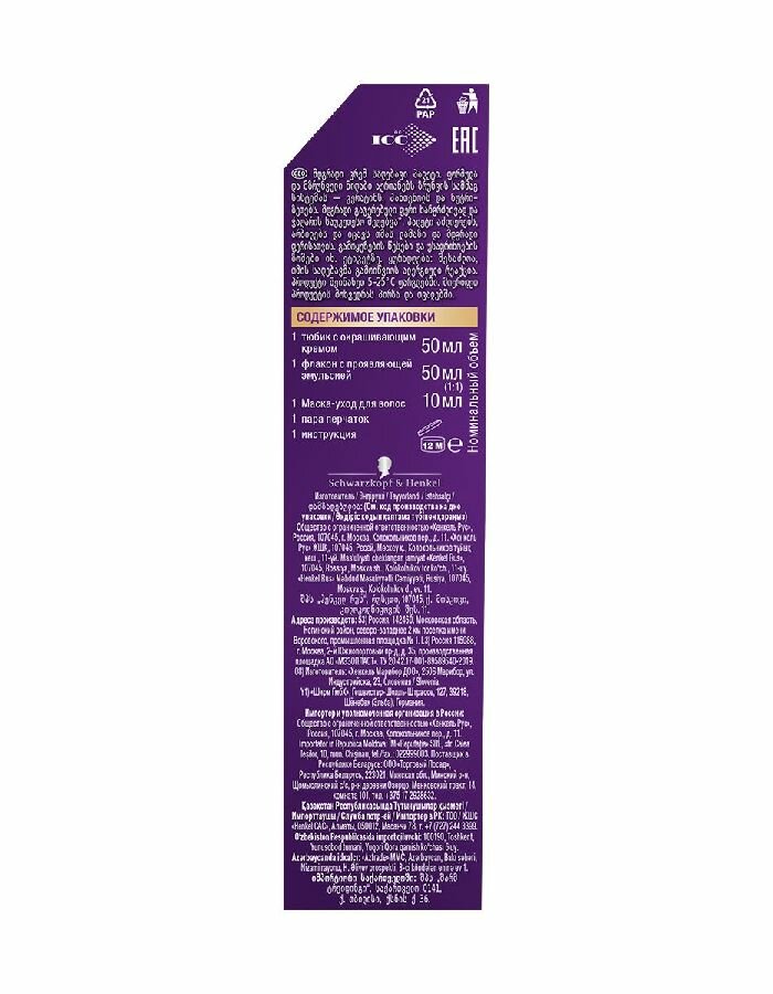 | Отзыв: | В состав краски входит тюбик с самой крем-краской, проявляющая эмульсия, перчатки, маска для ухода за волосами после окрашивания и инструкция.