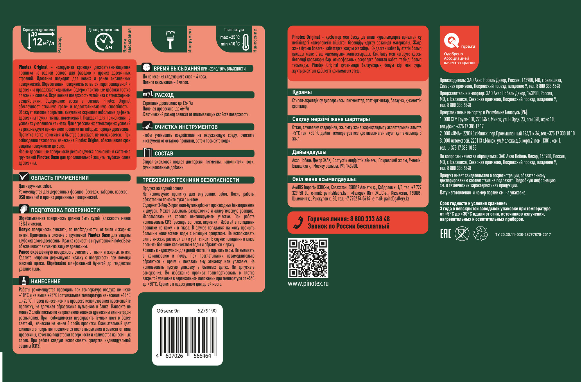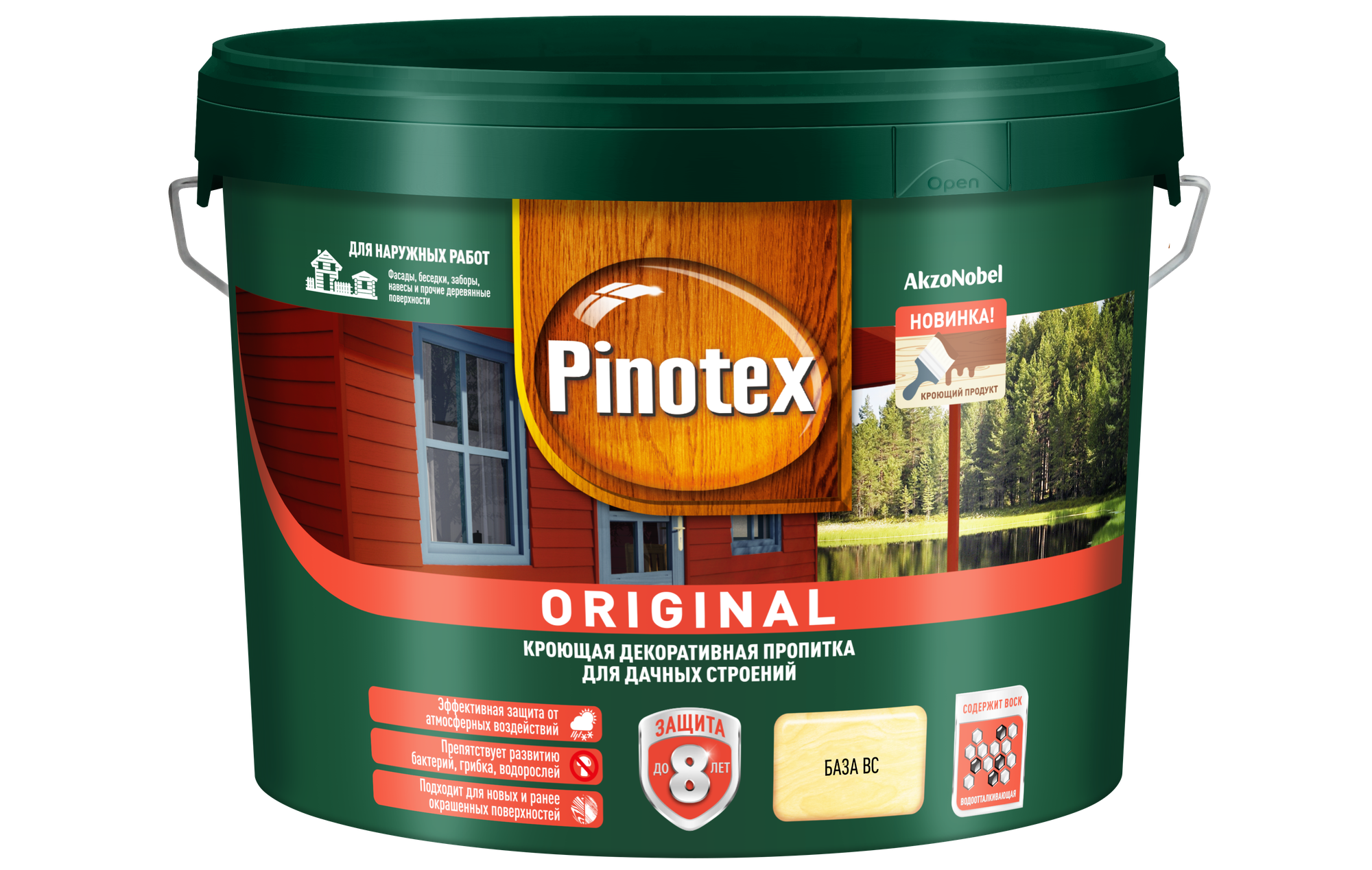 PINOTEX ORIGINAL пропитка декоративная кроющая для дачных строений и OSB, база CLR (8,4л)