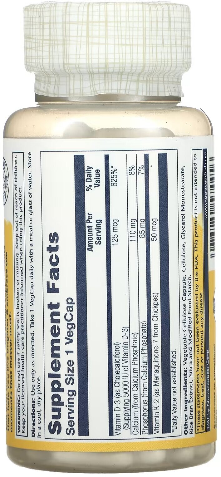 | Состав | Витамин D3 (в виде холекальциферола) (источник 5000 МЕ витамина D) 125 мкг; Кальций (из фосфата кальция) 110 мг; Фосфор (из фосфата кальция) 85 мг; Витамин K2 (в виде менахинона-7 из нута) 50 мкг; Капсула из растительной целлюлозы, целлюлоза, глицерол моностеарат, экстракт рисовых отрубей, диоксид кремния и модифицированный пищевой крахмал |