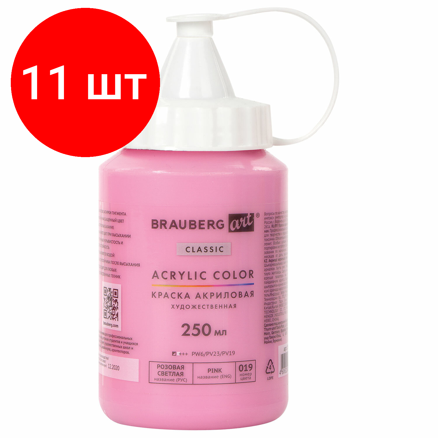 Купить Комплект 11 шт, Краска акриловая художественная BRAUBERG ART CLASSIC, флакон 250 мл, розовая светлая, 191710