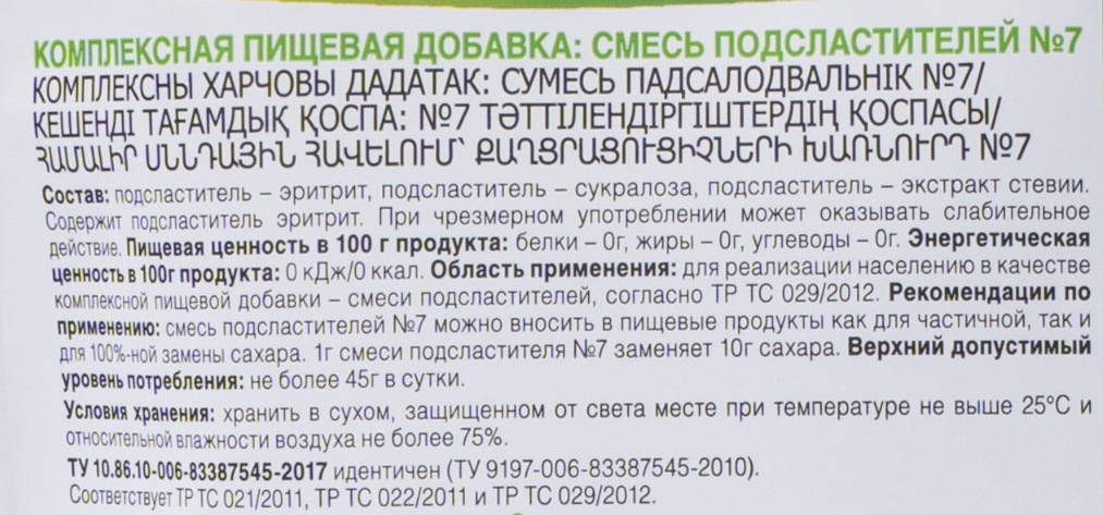 | Дополнительная информация | хранить в сухом, защищенном от света месте при температуре не выше 25°С и относительной влажности воздуха не более 75%; 1 г смеси заменяет 5 г сахара; рекомендуемая дозировка: не более 45 г в сутки; при чрезмерном употреблении может вызвать послабляющее действие |
