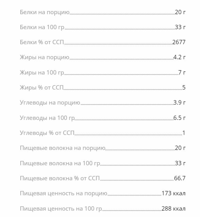 | Энергетическая ценность на 100 г | содержание белков в 100 г: 33 г; содержание жиров в 100 г: 11.6 г; содержание углеводов в 100 г: 6.7 г; калорийность 100 г: 336 ккал |