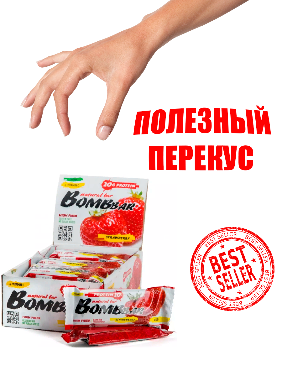 Bombbar Набор батончиков неглазированных протеиновых, вкус клубника 20 штук по 60 г