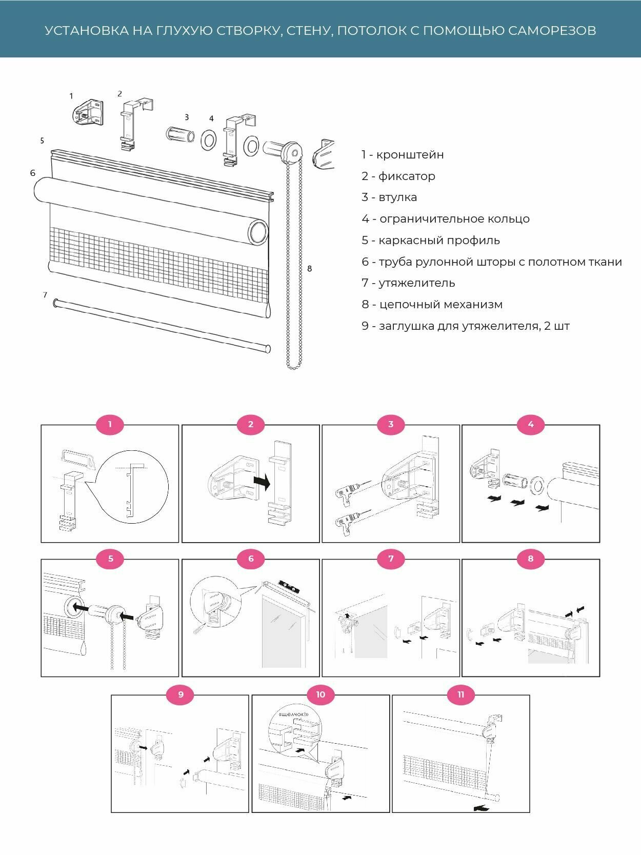 | Комплектация | рулонная штора мини в сборе, цепочный механизм, комплект кронштейнов для откидной створки без сверления, утяжелитель для ткани с фиксирующими заглушками, инструкция по монтажу |