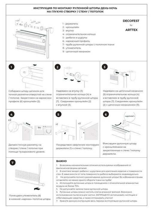 | Комплектация | рулонная штора мини в сборе, цепочный механизм, комплект кронштейнов для откидной створки без сверления, утяжелитель для ткани с фиксирующими заглушками, инструкция по монтажу |