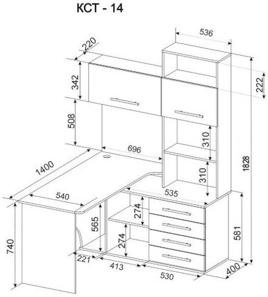 Стол компьютерный КСТ-14П правый, цвет дуб делано, ШхГхВ 140х124х183 см., выдвижные ящики справа, стол с тумбой и надстройкой