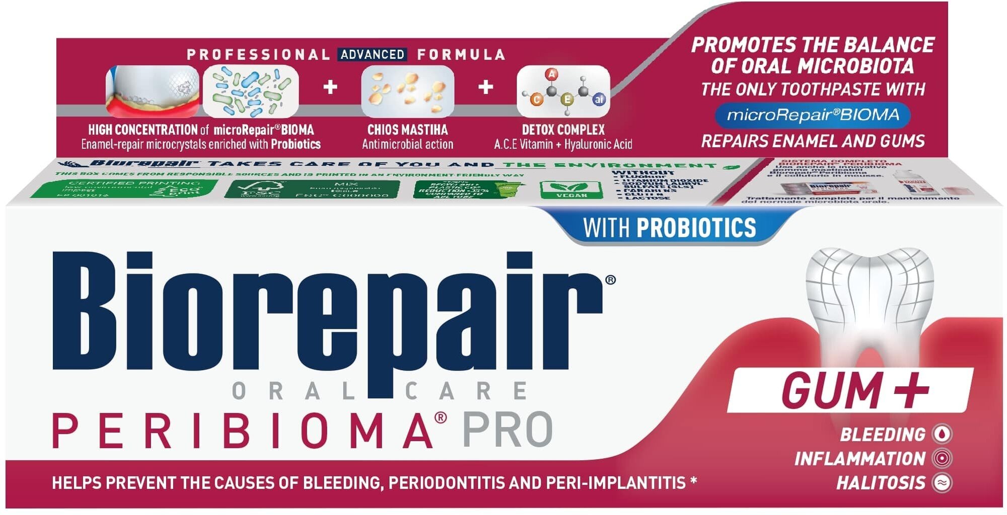 | Состав | aqua, zinc hydroxyapatite, sorbitol, glycerin, hydrated silica, silica, cocamidopropyl betaine, cellulose gum, zink pca, aroma, pistacia lentiscus (mastic) gum oil, ascorbic acid, tocopheryl acetate, retynil palmitate, sodium hyaluronate, hamamelis virginiana leaf extract, spirulina platensis extract, calendula officinalis flower extract, eucaliptus globulus leaf oil, bifidobacterium*, lactobacillus*, sodium myristoyl sarcosinate, sodium methyl cocoyl taurate, phenoxyethanol, benzyl alcohol, sodium benzoate, sodium saccharin, potassium sorbate, maltodextrin, citric acid, helianthus annuus seed oil, bht, limonene, eugenol, cl 77891, cl 73360, microrepairbioma |