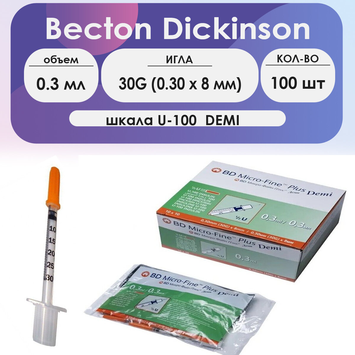 Шприц инсулиновый BD Micro-Fine Plus Demi U-100 трехкомпонентный, 8 мм x 0.3 мм, размер: 30G, 0.3 мл, 100 шт.