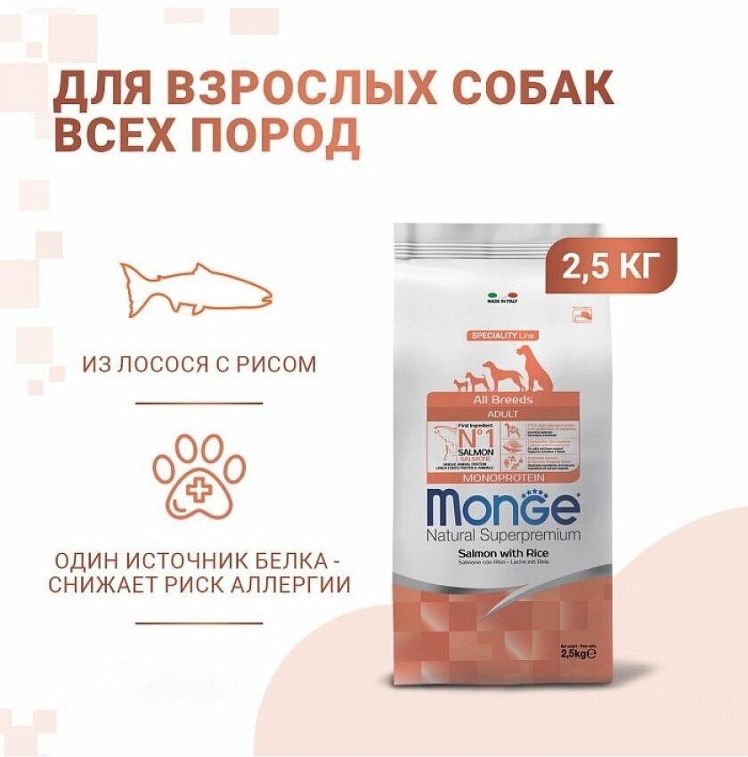 Monge Dog Monoprotein Корм для собак всех пород с Лососем и Рисом монопротеиновый, 2.5 кг