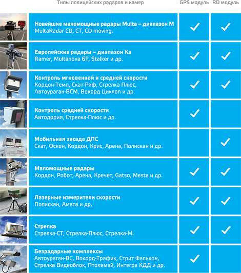 | Обнаружение радаров | "Кордон" / "Стрелка" / "Арена" / "Кречет" / "Автодория" / "Оскон" / "Скат" / "Robot" / "Автоураган" |